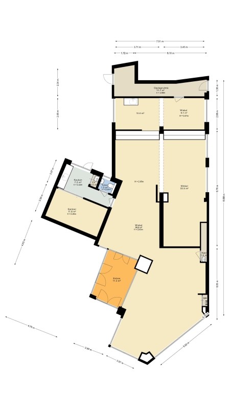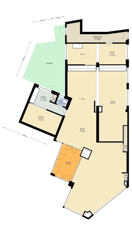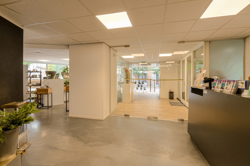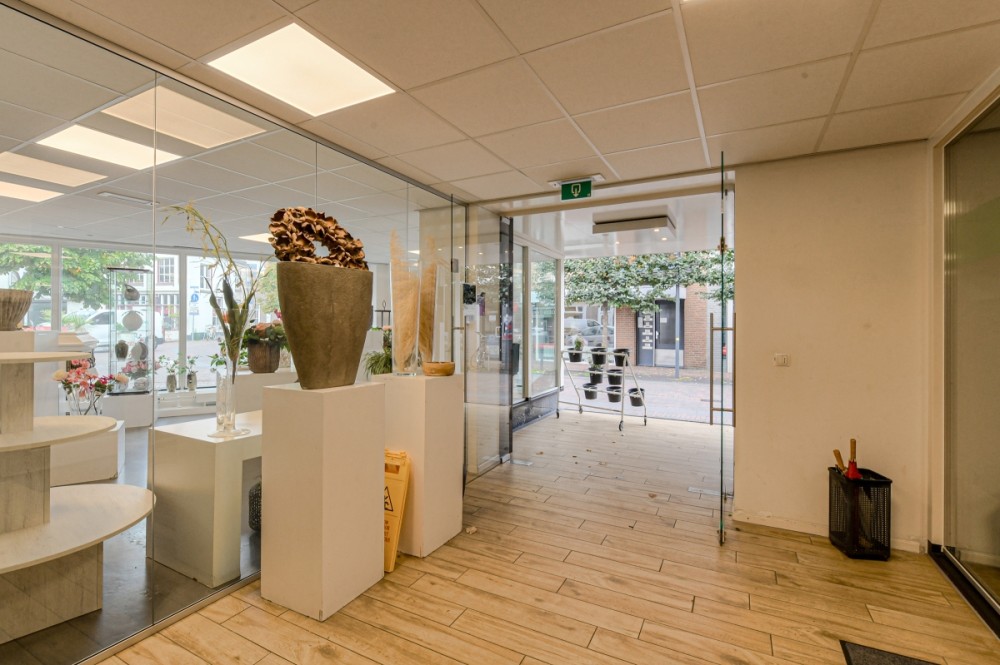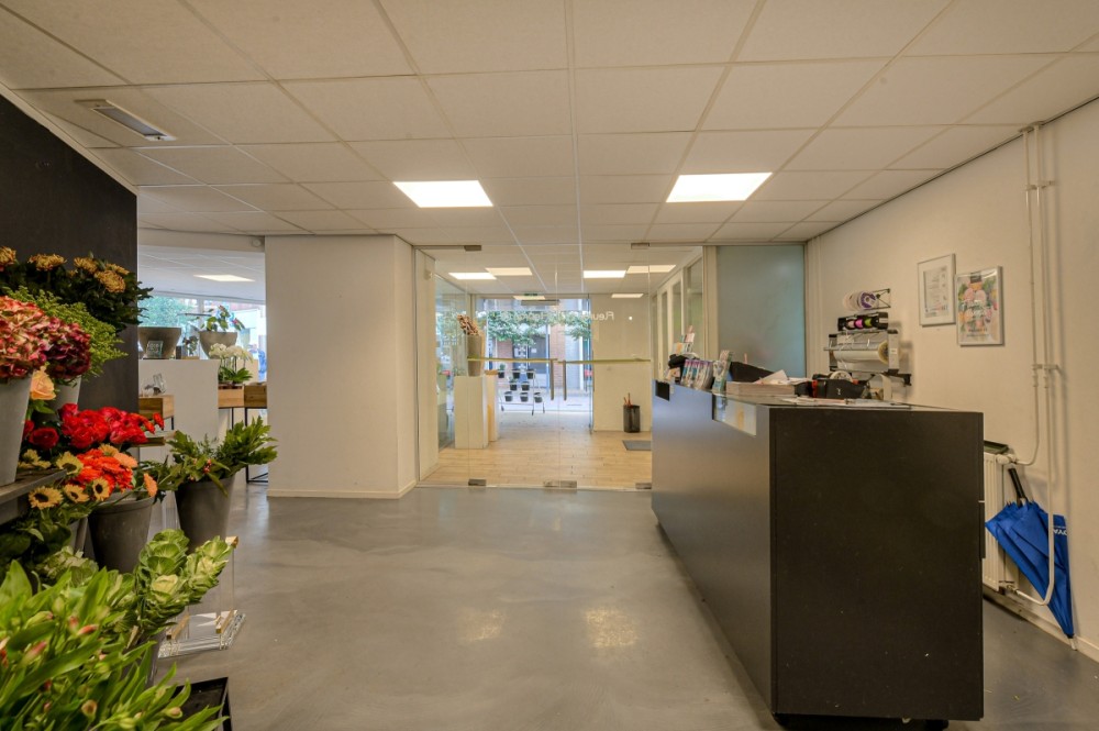 Middels een centrale overkapte entree komt u in het voorportaal. Vanuit dit voorportaal heeft u middels een glazen pui toegang tot de winkelunit De winkelunit bestaat uit circa 142 m² winkeloppervlak en een etalagefront van circa 9.00 m. De winkelruimte bestaat uit circa 142m² winkeloppervlak. Kantoorruimte, kitchenette, magazijnruimte en toilet bedraagt circa 30m².