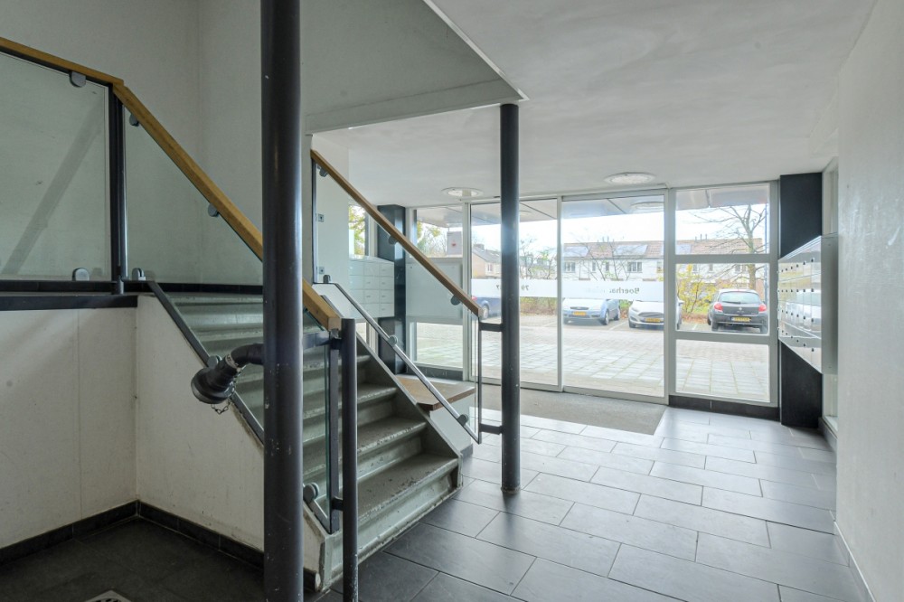 Entree met brievenbussen, intercom met videofooninstallatie, trappenhuis en liftinstallatie.