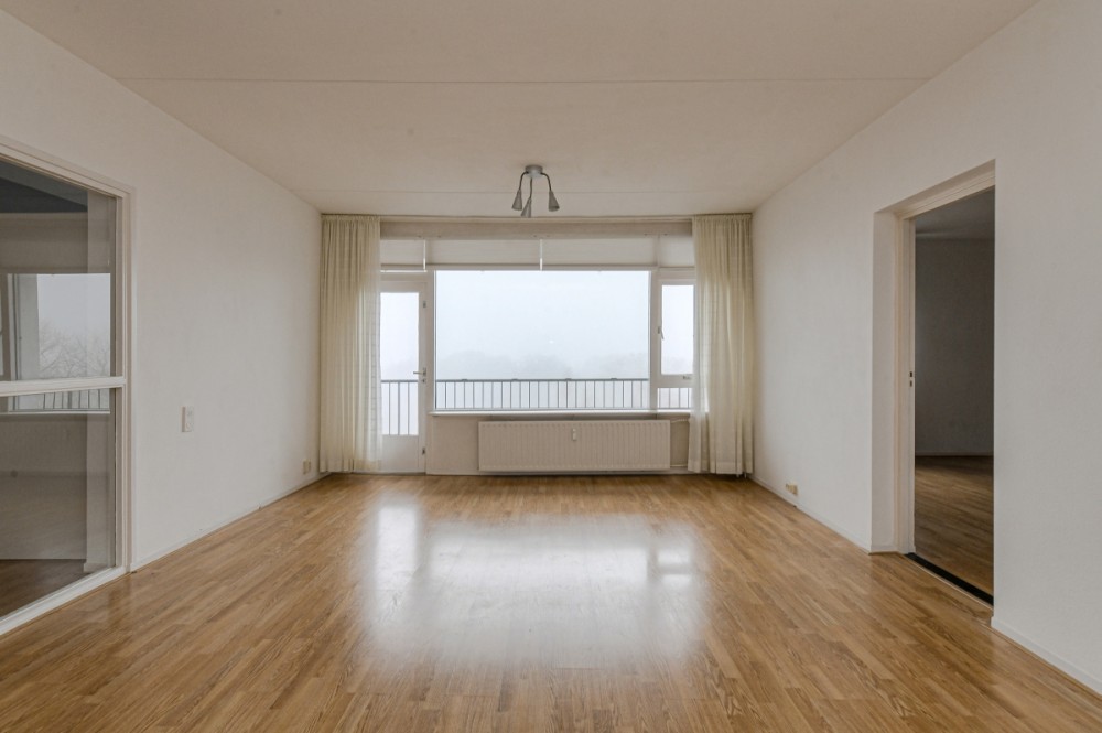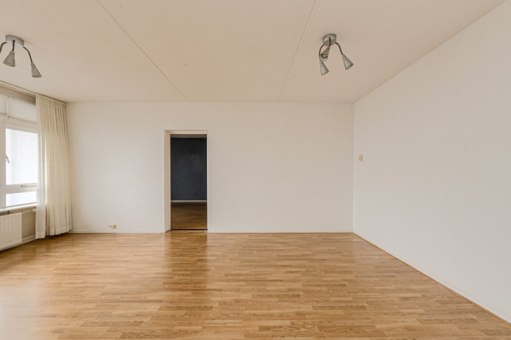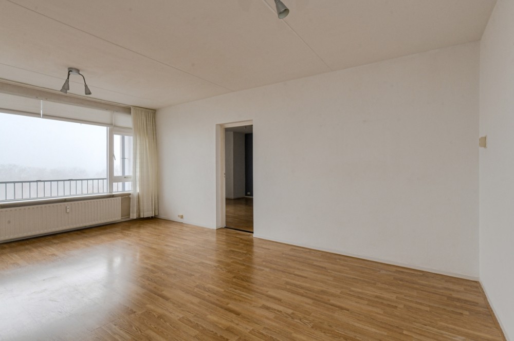 De ruime, lichte woonkamer, afmeting ca. 6.11 x 4.27 m., geeft middels loopdeur toegang tot het op het oosten gesitueerde balkon met zicht over een groenstrook met bomen. Vanuit de woonkamer is er de doorloop naar een grote slaapkamer annex werkkamer met een afmeting van circa 5.41 x 4.50 m. De slaapkamer beschikt over 2 ruime inbouwkasten. In de grootste inbouwkast is er een mogelijkheid om een aansluiting ten behoeve van de wasautomaat te realiseren (water aan- en afvoer aanwezig).