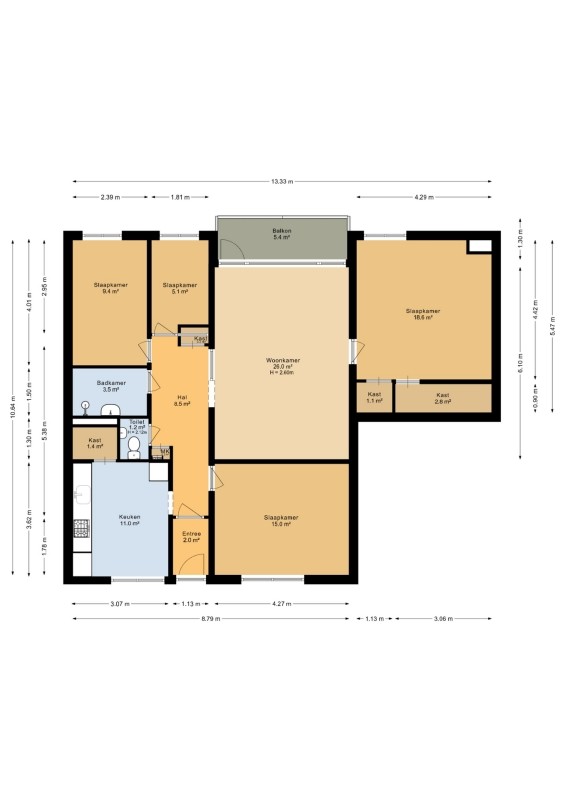Vanuit de hal zijn de andere drie slaapkamers, badkamer en toiletruimte te bereiken.
