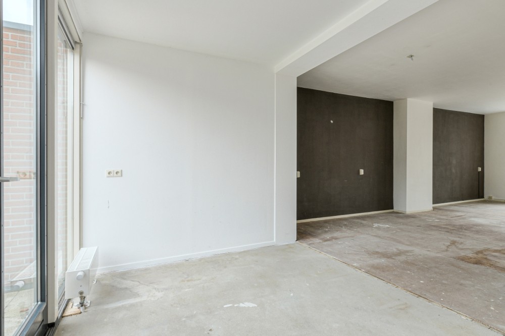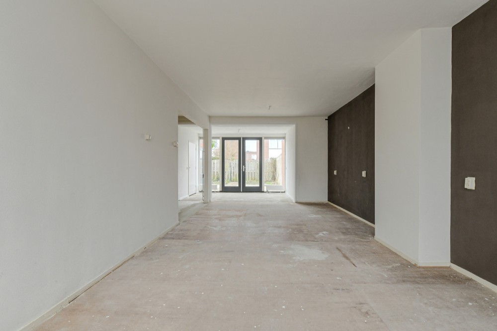 Woon/eetkamer afmeting circa 10,21 x 3.67 m, type doorzon met uitbouw, openslaande tuindeuren en grote raampartij aan de voorzijde. De wanden en plafonds zijn strak afgewerkt.