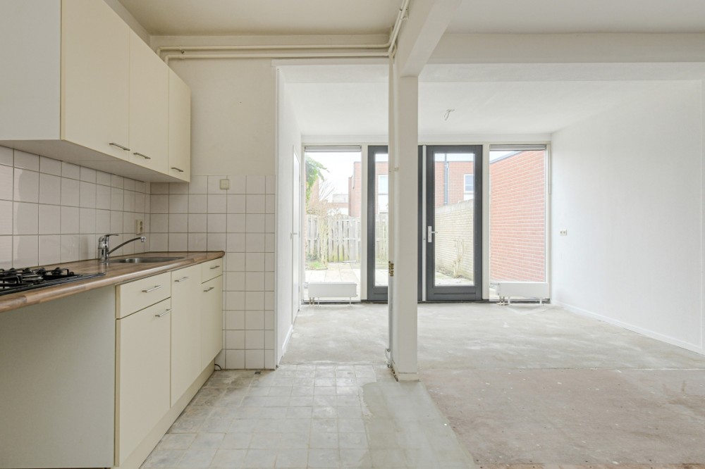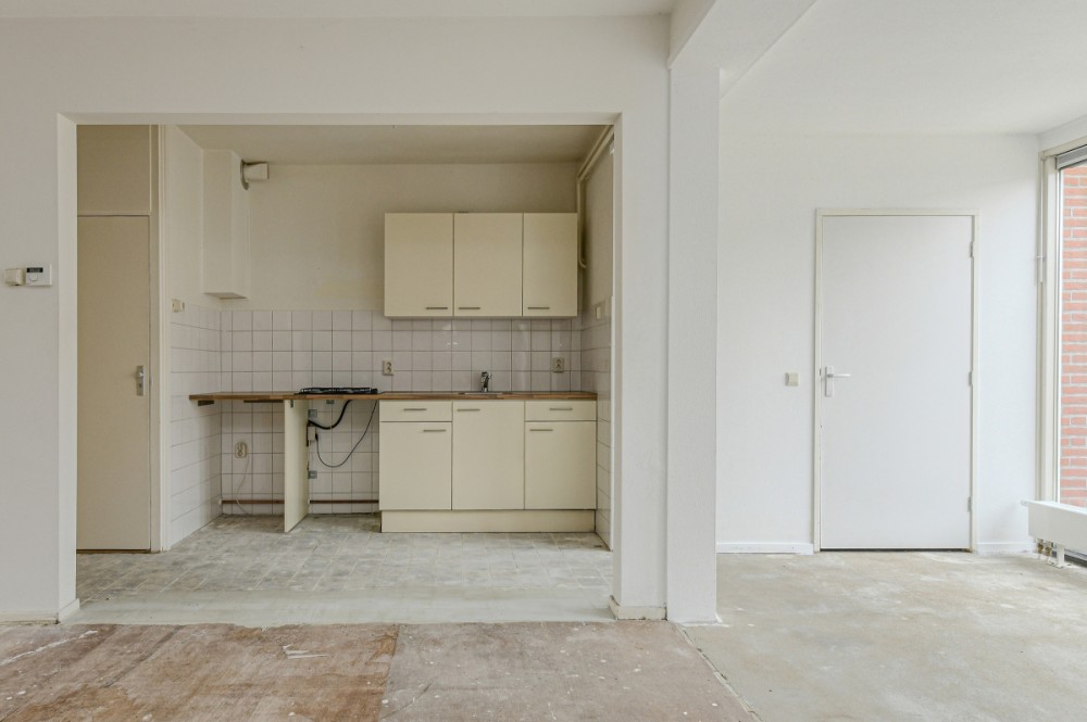 Open keukenruimte afm. ca. 7.40m² welke is voorzien van een keukenblok, in een rechte opstelling geplaatst en beschikt over een spoelbak, afzuiging, 4 pits gasplaat, elektra en meer dan voldoende kastruimte.