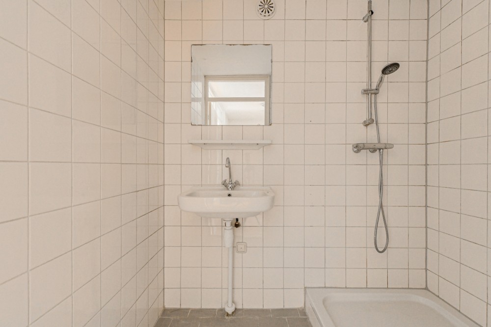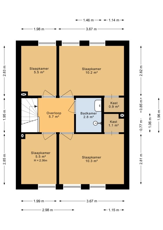 De overloop (ca.5.6m²) biedt toegang tot de vier slaapkamers en tot de badkamer. De badkamer is voorzien van een wastafel, tegelvloer en een inloopdouche. Vrijwel de gehele eerste verdieping is voorzien van een laminaat vloer.