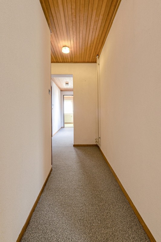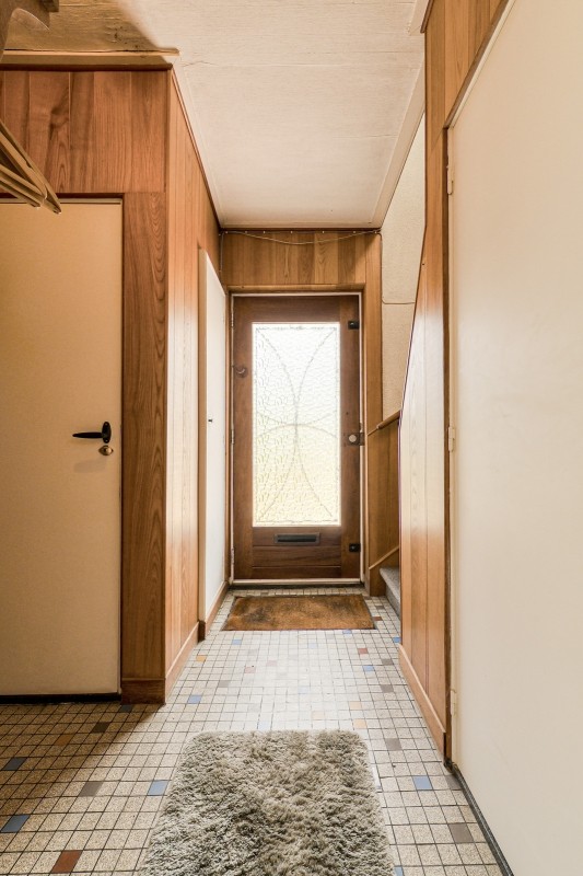 De hal is voorzien van een meterkast en biedt toegang tot de kelderkast, het toilet, de woonkamer en trapopgang naar de verdieping.