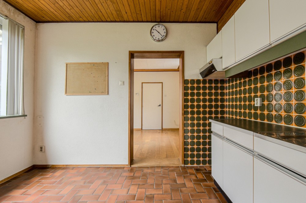 Eenvoudige ruime Tielsa keuken, afm. ca. 12,5m², met tegelvloer en doorloop naar de bijkeuken.