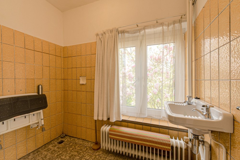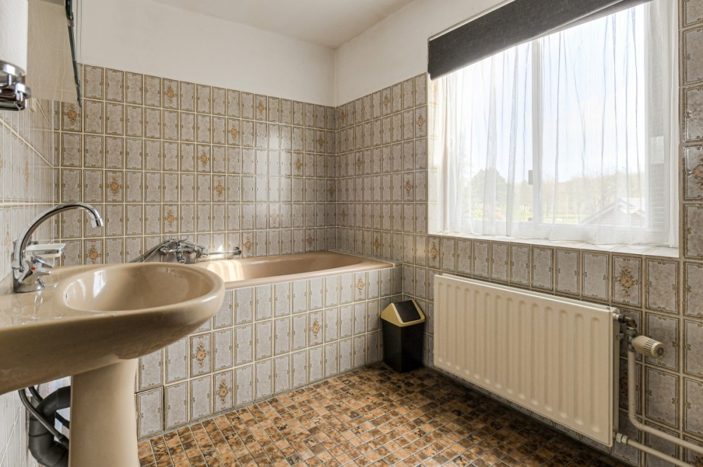 Badkamer 1: De gedeeltelijk betegelde badkamer is voorzien van een wastafel, duoblok toilet, ligbad, mechanische ventilatie en een raam voor natuurlijke ventilatie en daglichttoetreding.