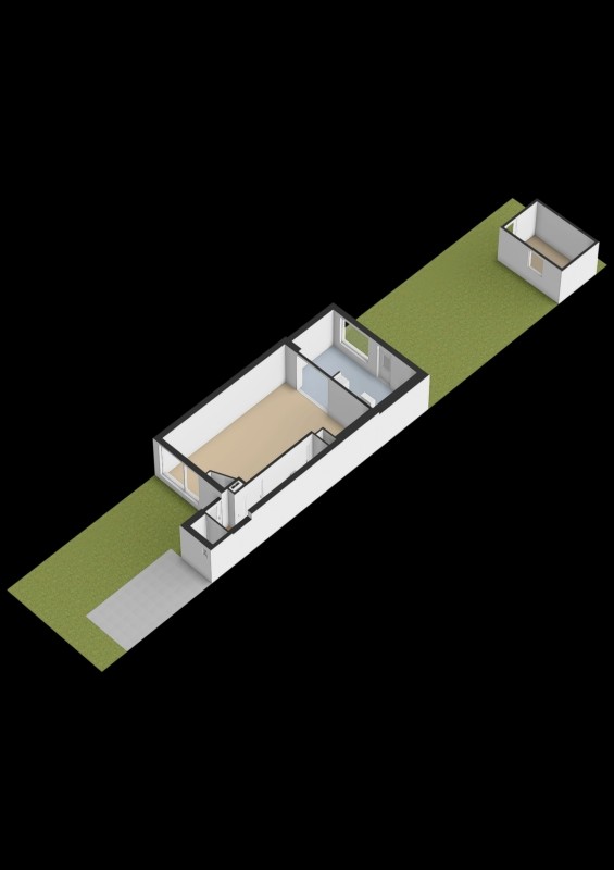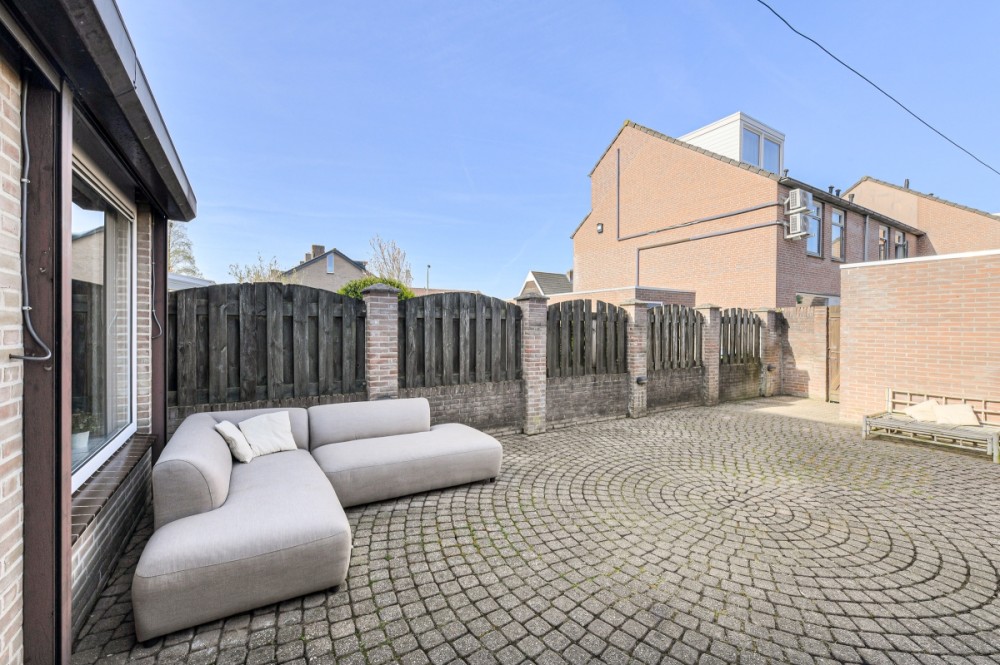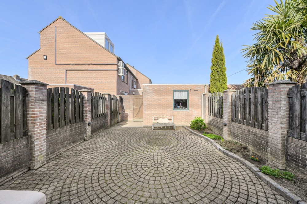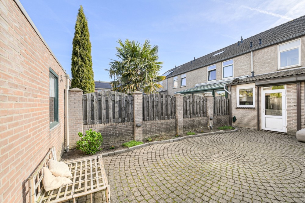 Geheel omsloten tuin met grotendeels straatwerk en achterom. Stenen berging voorzien van elektriciteit.