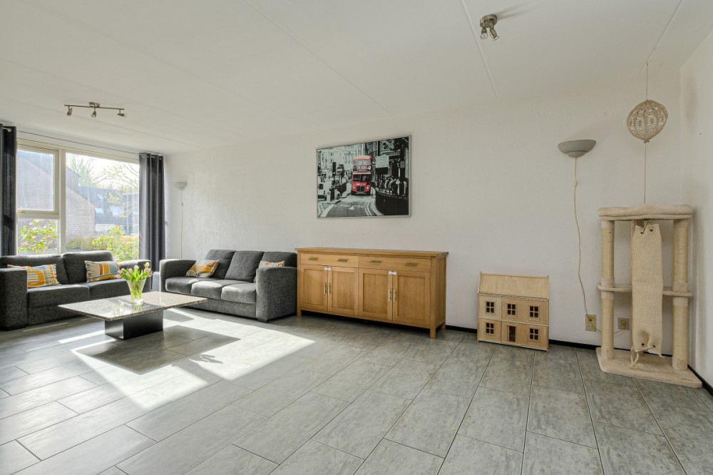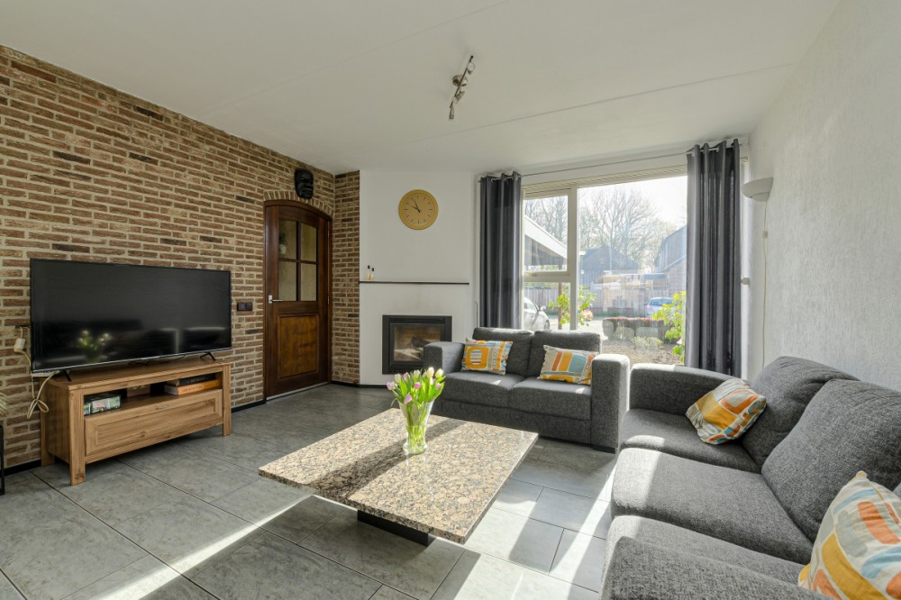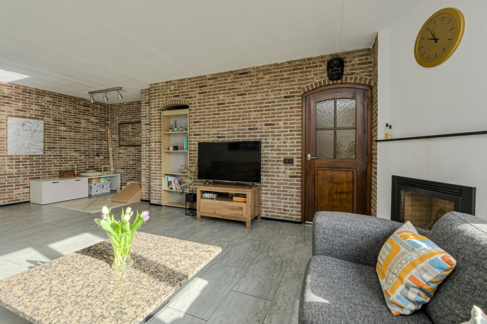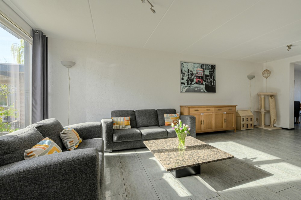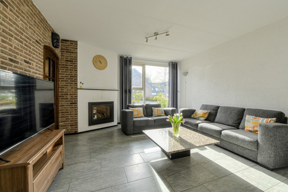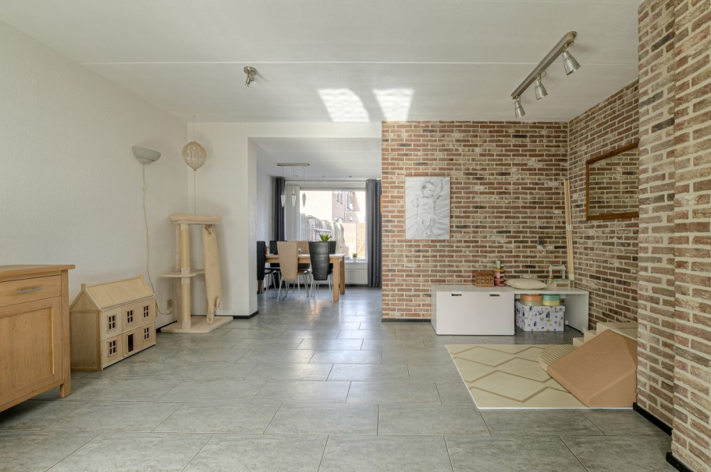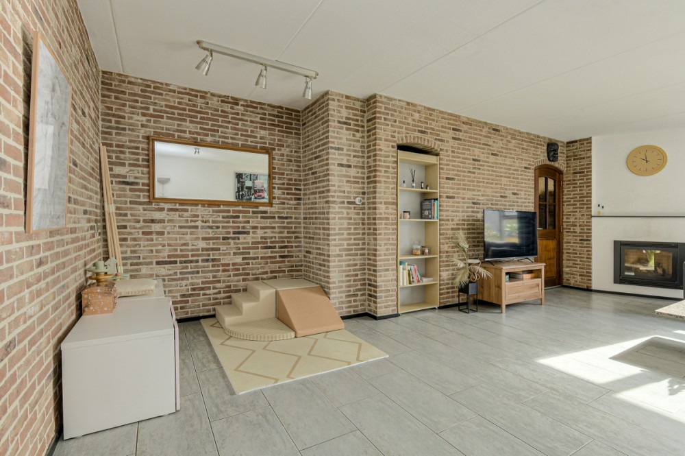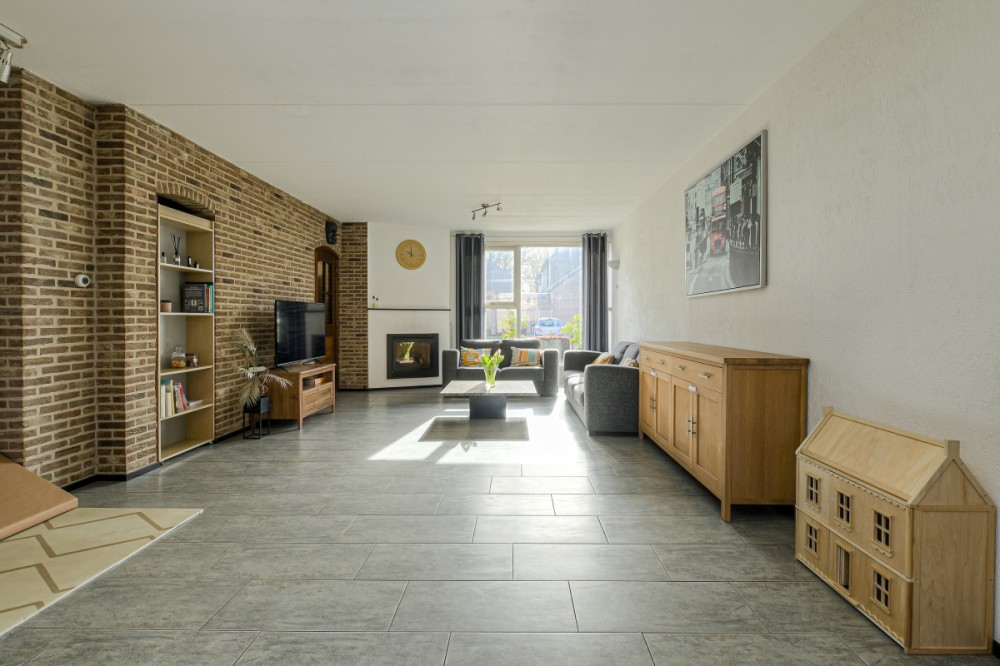 Riante woon/eetkamer met tegelvloer voorzien van vloerverwarming, granolwanden, gashaard in schouw en bergruimte onder de trap waar tevens de unit van de vloerverwarming is gesitueerd.