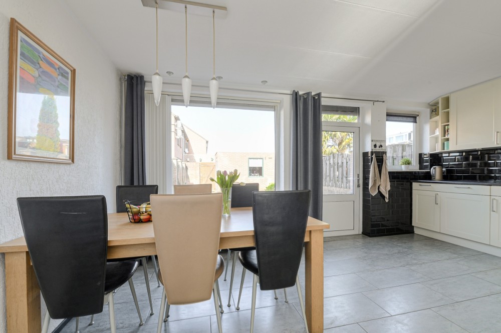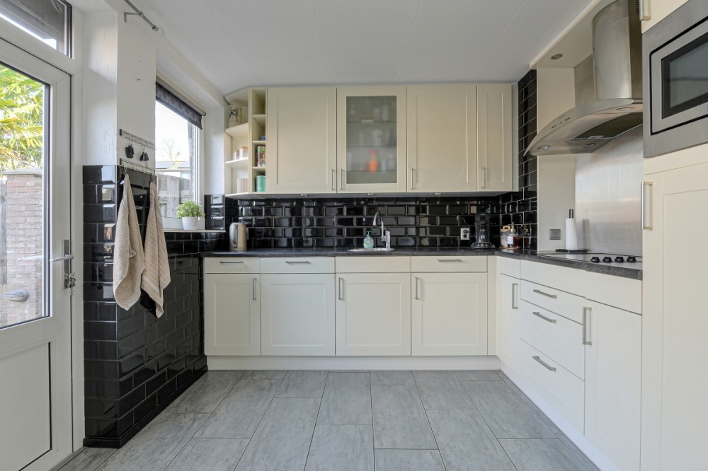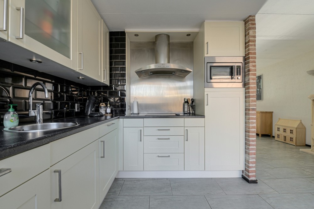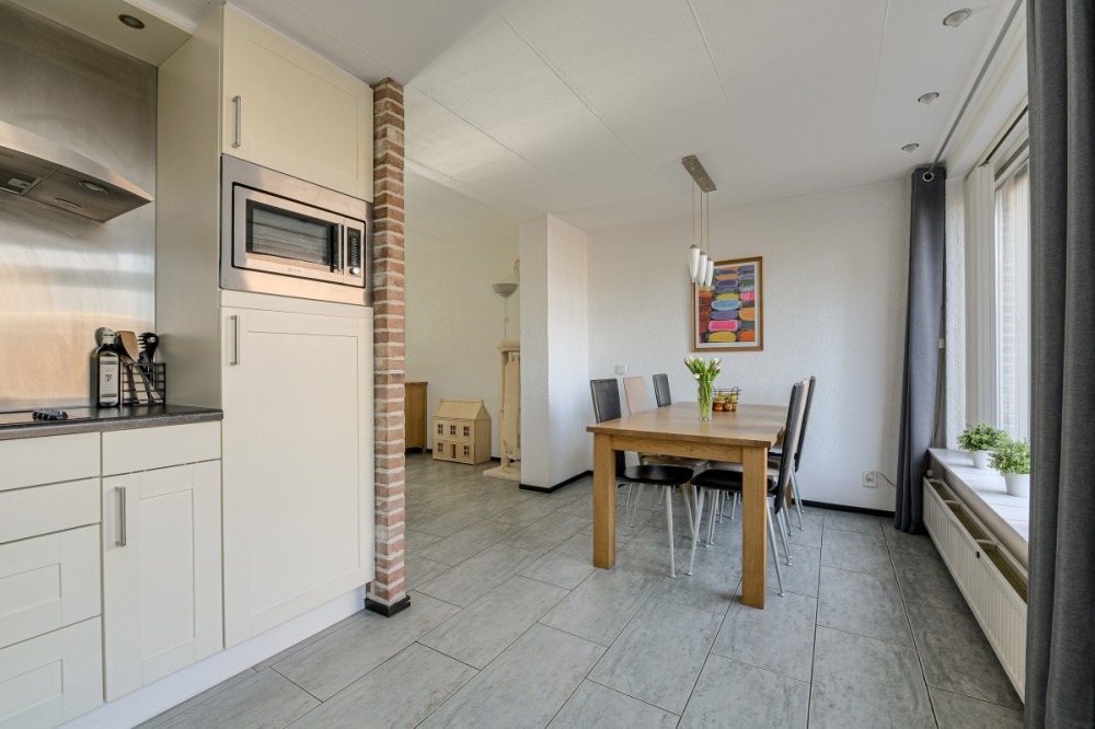 Over de volle breedte uitgebouwde woon/eetkeuken met eveneens tegelvloer met vloerverwarming, keukenopstelling met diverse boven- en onderkasten, inclusief diverse inbouwapparatuur, te weten; keramische kookplaat, afzuigkap, combinatie oven/magnetron en koelkast. Vanuit de keuken is er een loopdeur naar de tuin.