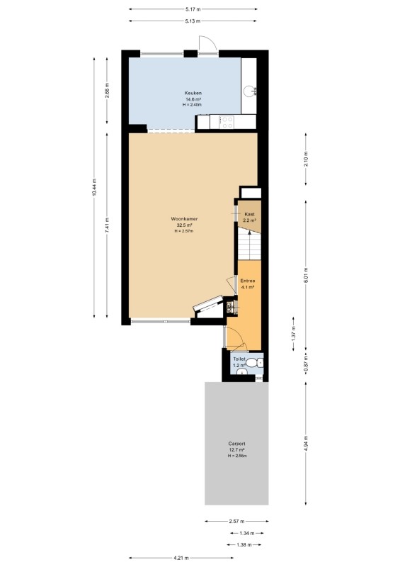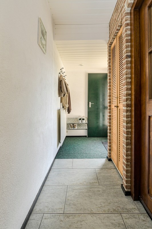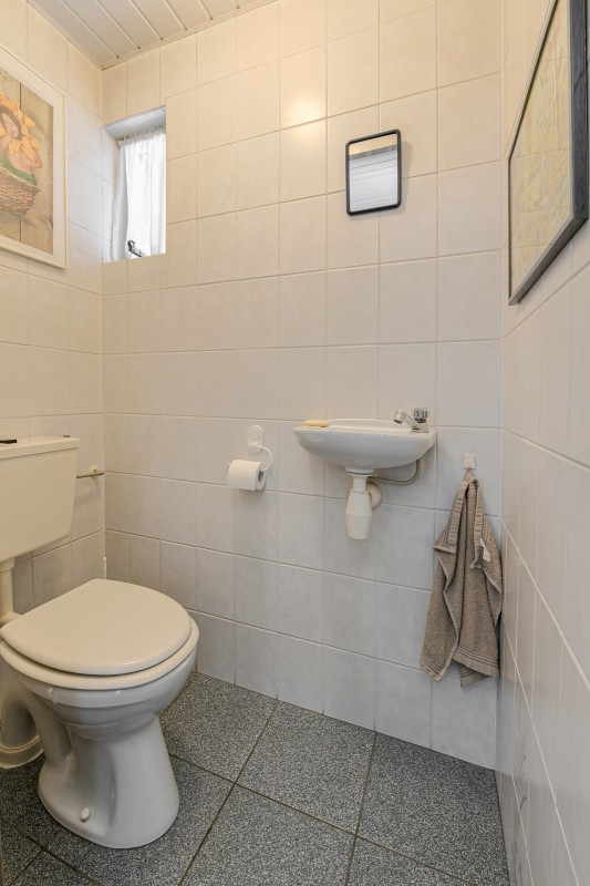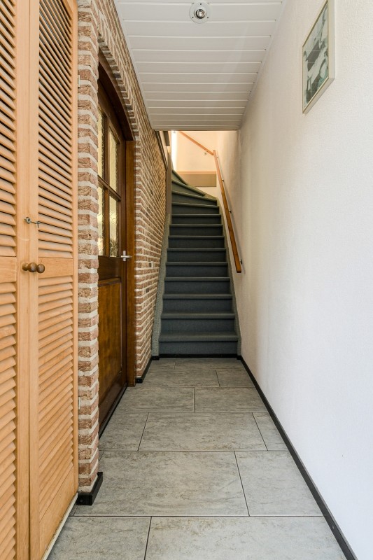 Entree/hal met meterkast, tot plafond betegeld toilet met fontein en trapopgang.