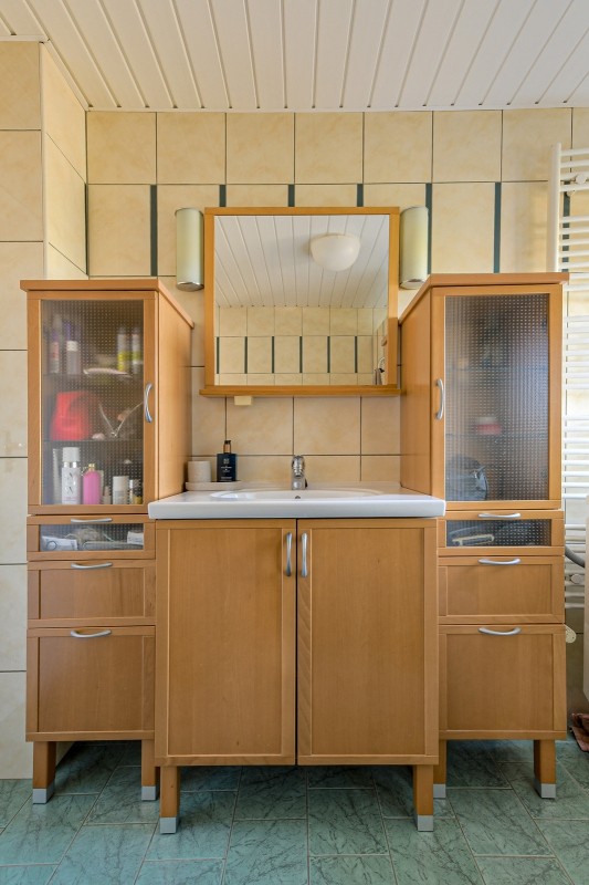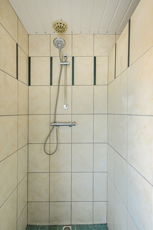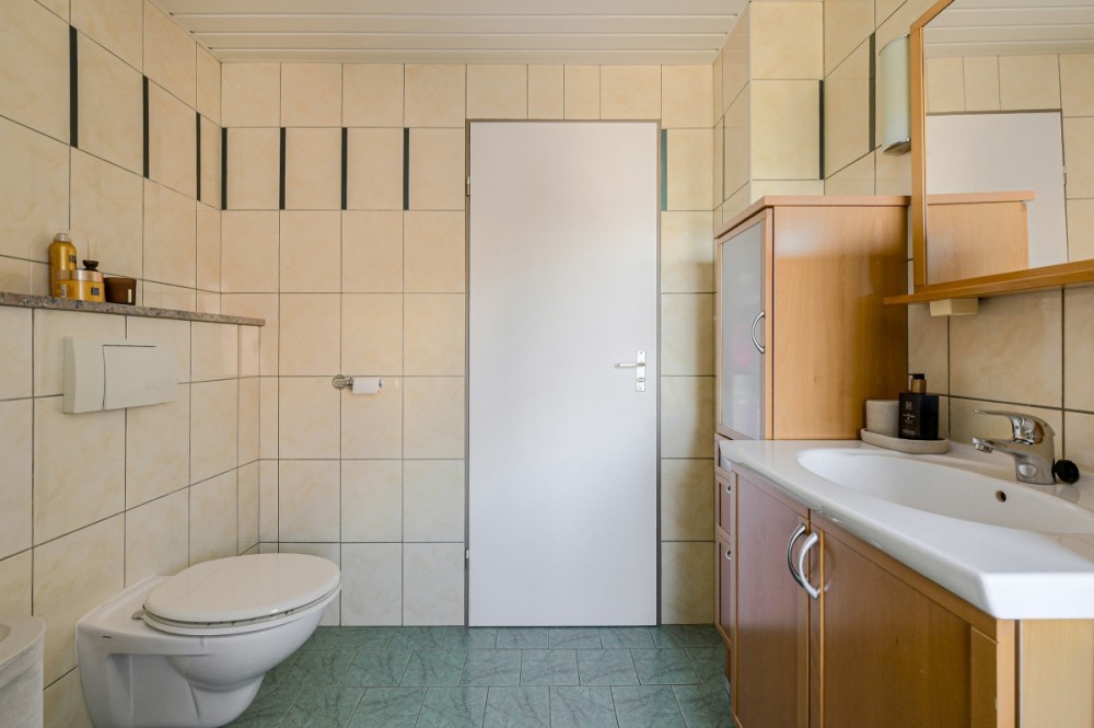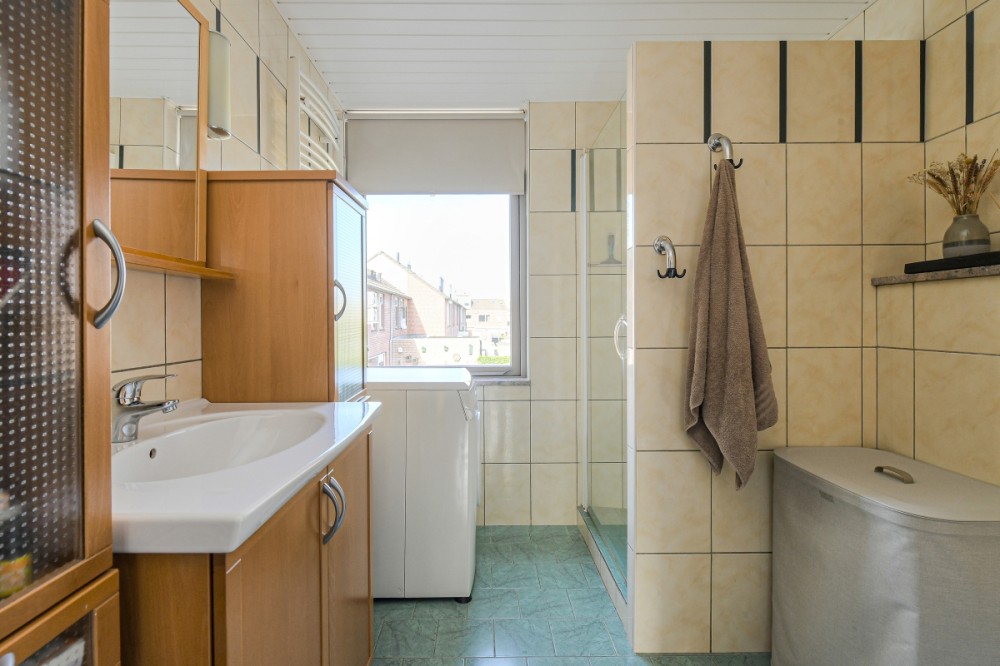 Betegelde badkamer met douche, wastafelmeubel, toilet en aansluiting ten behoeve van de wasautomaat.