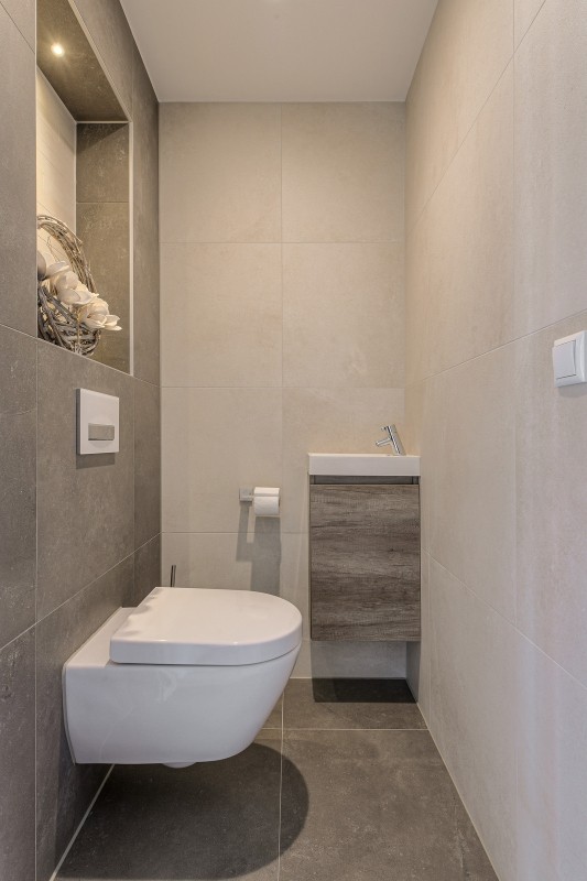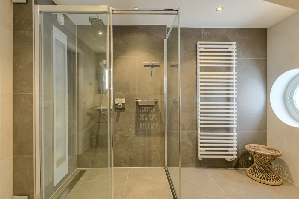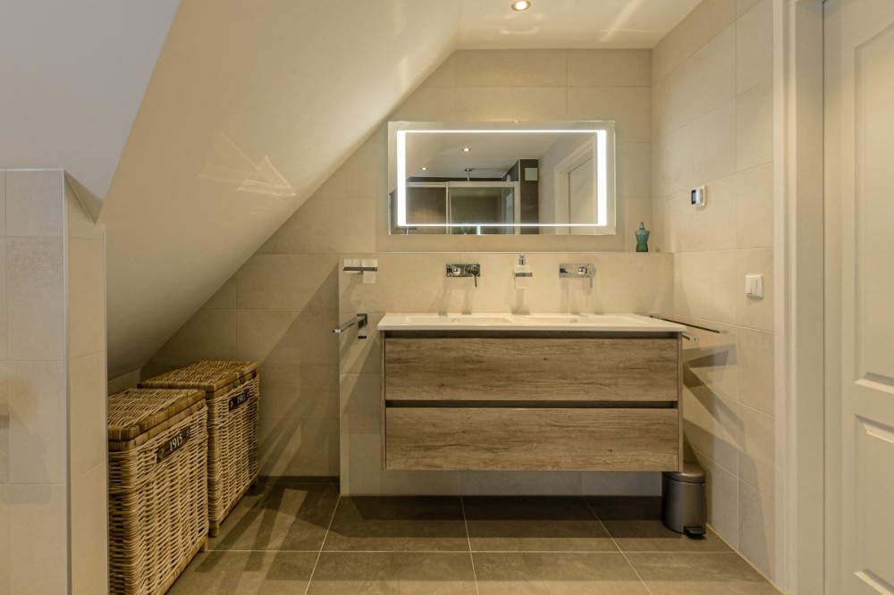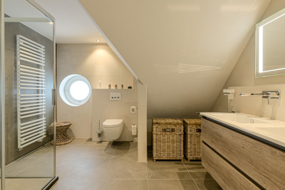 De ruim opgezette badkamer (ca. 8.8 m²) is voorzien van vloerverwarming, een inloopdouche v.v. sunshower en een twee persoons wastafelmeubel en toilet.
