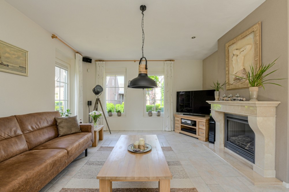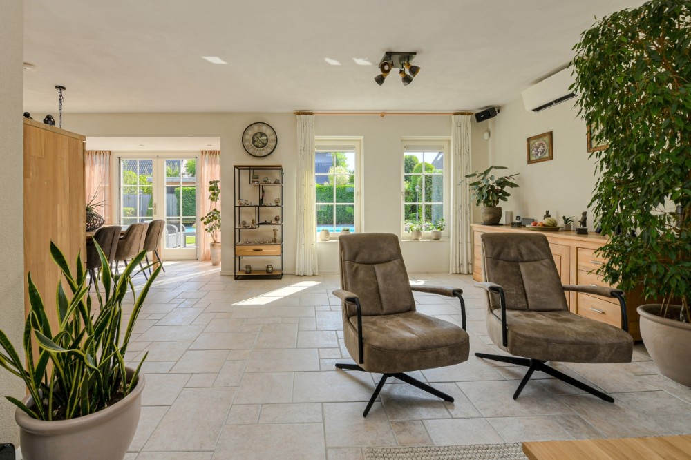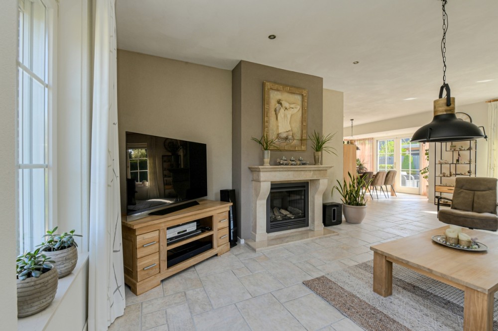 Sfeervolle woonkamer, voorzien van een gashaard, plavuizen vloer v.v. vloerverwarming over gehele benedenverdieping, airconditioning, stucwerk wanden/ plafond en erker met openslaande deuren welke toegang geven tot het zonneterras.