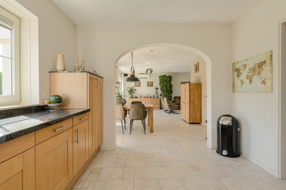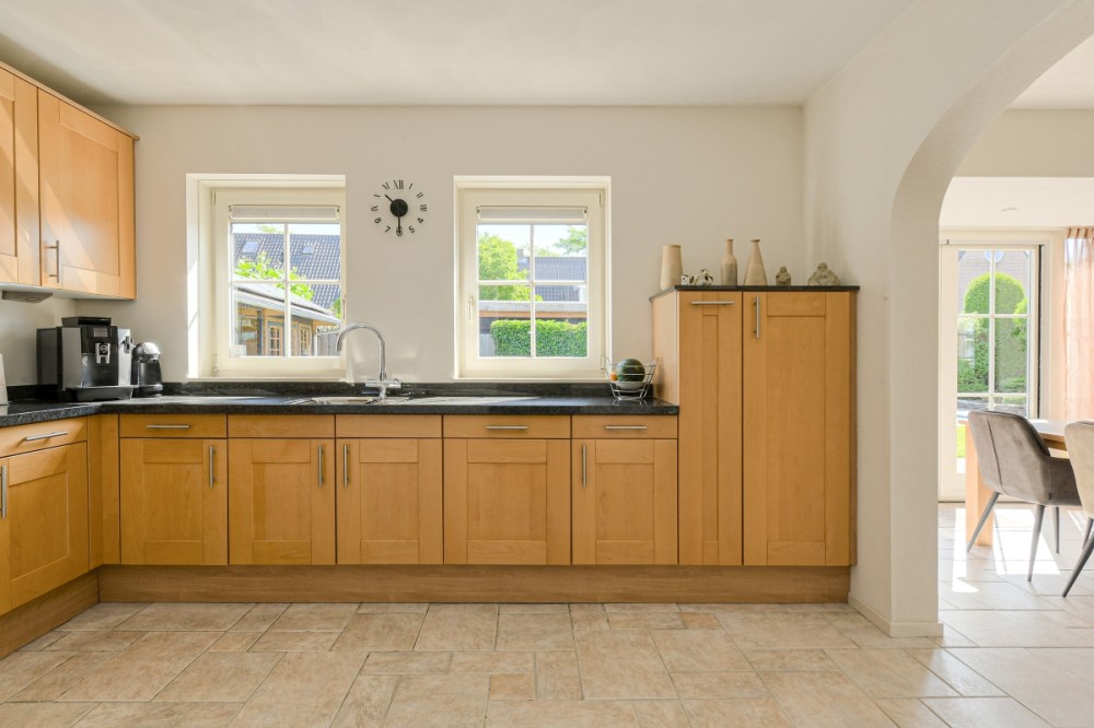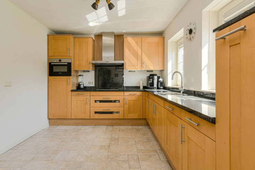 De open keuken met veel lichtinval heeft een hoekopstelling met perenhout keukenfronten en is van alle gemakken voorzien: een hardstenen werkblad, inductie kookplaat (Siemens) met RVS afzuigkap (Siemens), Quooker (Grohe red), oven/magnetron (Bosch), vaatwasser (Siemens), koelkast (Siemens) en voldoende kastruimte. Vanuit de keuken toegang naar bijkeuken met aansluiting t.b.v. de wasapparatuur en toegang tot de garage.