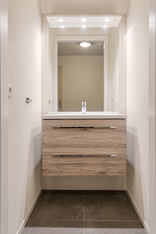 Vanaf de overloop te bereiken separate ruimte waarin wastafel met meubel.