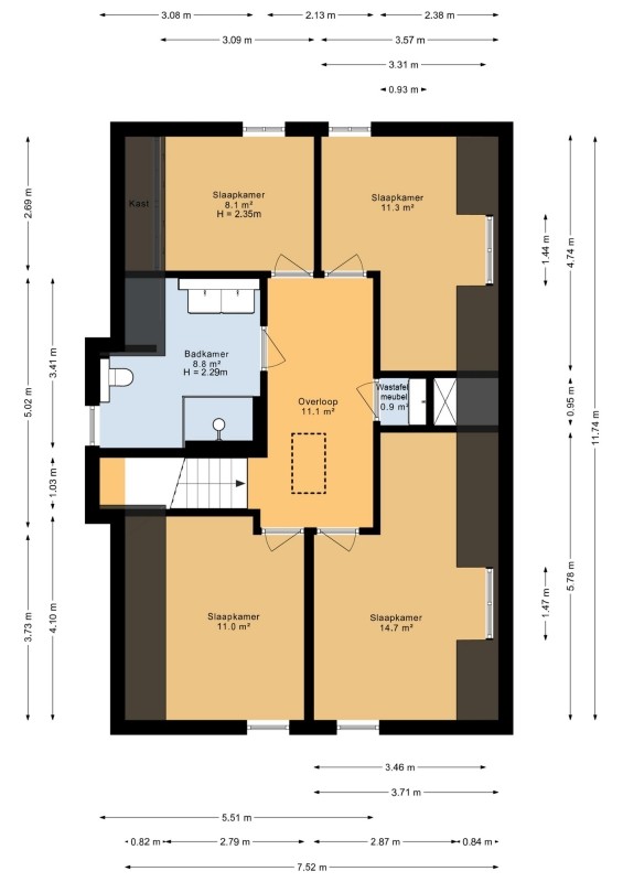 De overloop biedt toegang tot de separate ruimte waarin wastafel met meubel, vier slaapkamers, de compleet ingerichte badkamer en de vlizo trap welke toegang geeft tot de tweede verdieping.