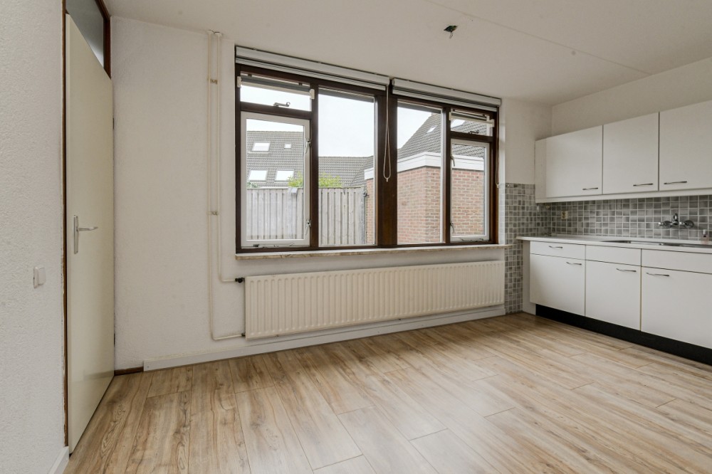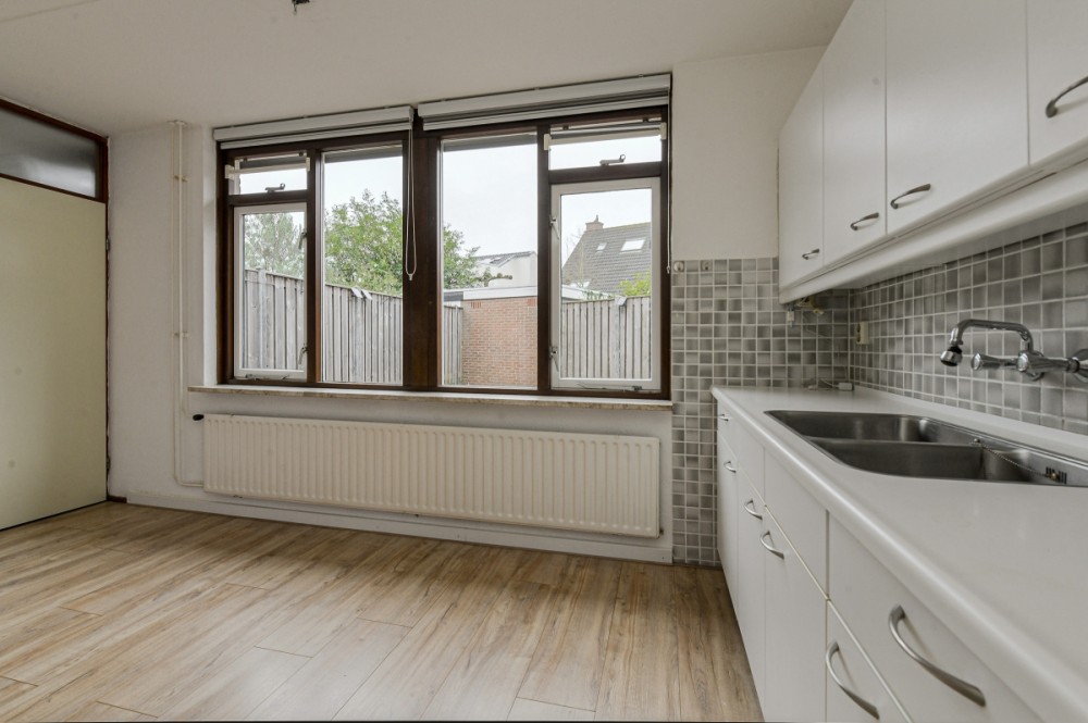 Vanuit de keuken is middels een tussenhalletje de achtertuin te bereiken.
