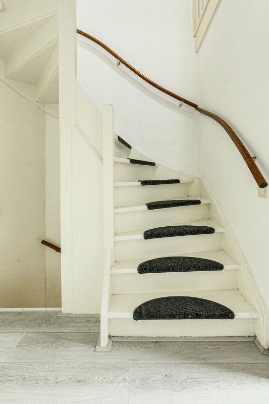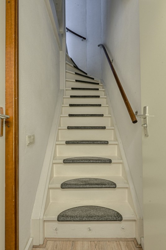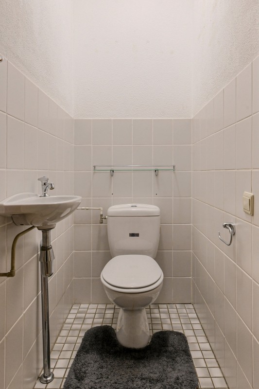 Vanuit de woon/eetkamer heeft u toegang tot de tussenhal met trapopgang naar de eerste verdieping en een gedeeltelijk betegeld toilet en fonteintje.
