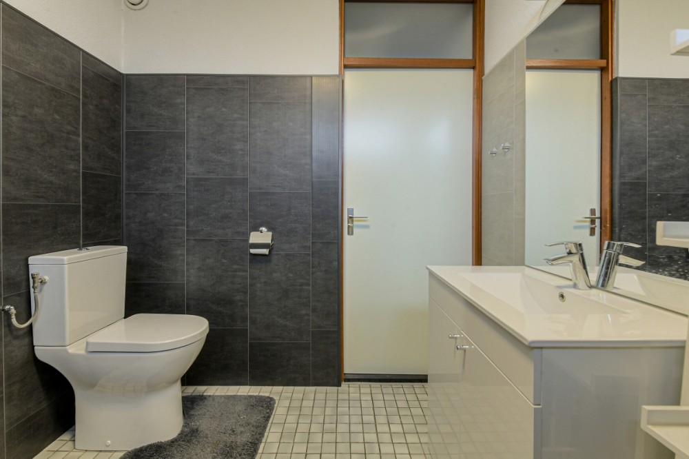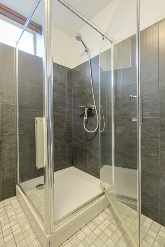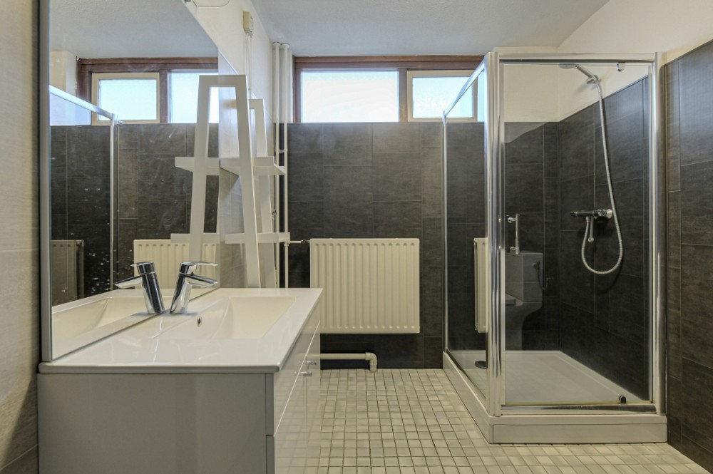 De eenvoudige badkamer afmeting circa 2.43 x 2.19 m. beschikt over een douche, vaste wastafel in meubel, toilet en aansluiting ten behoeve van de wasautomaat.
