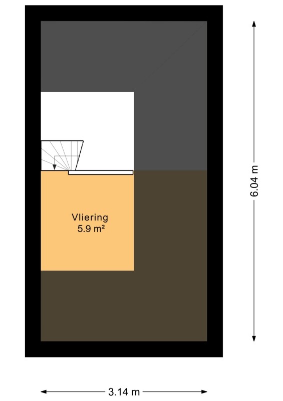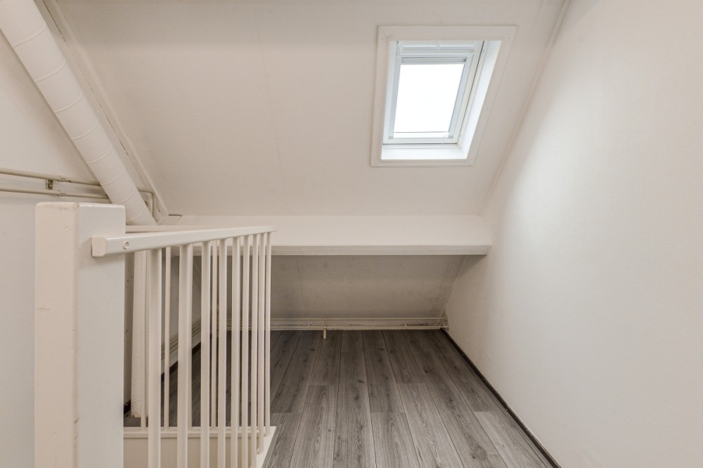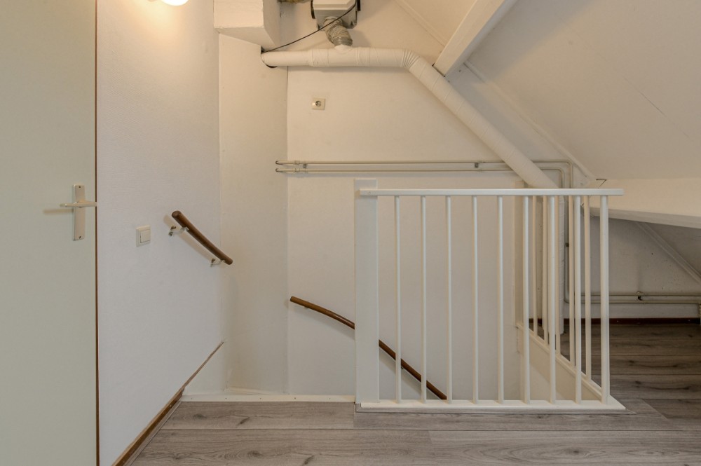 Overloop welke toegang geeft tot de twee slaapkamers, alsmede de badkamer en vaste trapopgang naar de tweede verdieping.