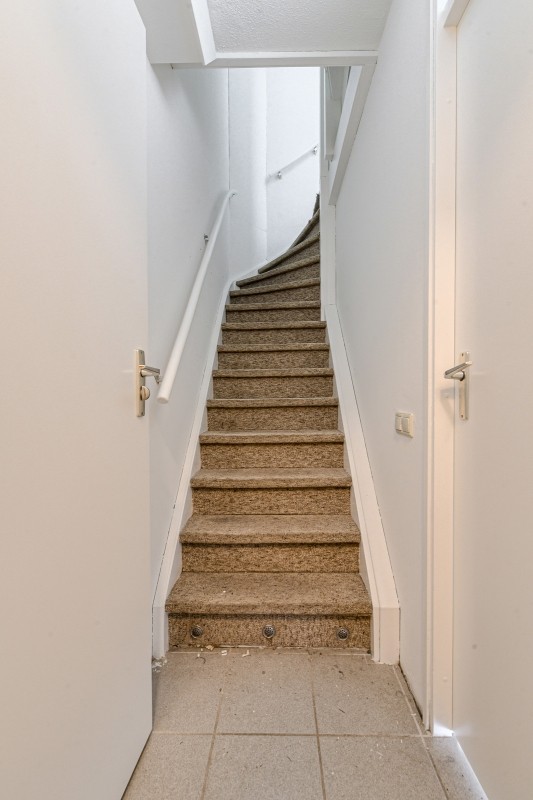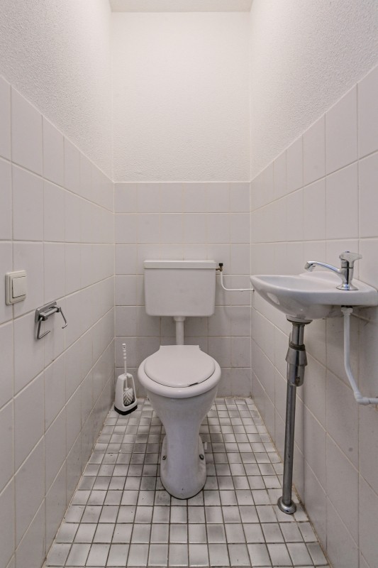 Vanuit de woon/eetkamer heeft u toegang tot de tussenhal met trapopgang naar de eerste verdieping en een gedeeltelijk betegeld toilet en fonteintje.