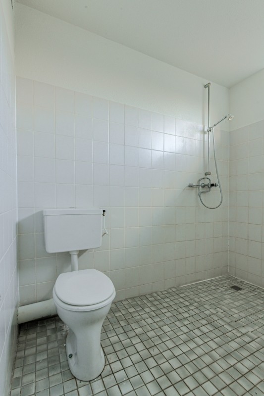 De eenvoudige badkamer afmeting circa 2.43 x 2.19 m. beschikt over een douche, vaste wastafel, toilet en aansluiting ten behoeve van de wasautomaat.