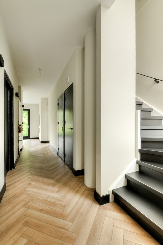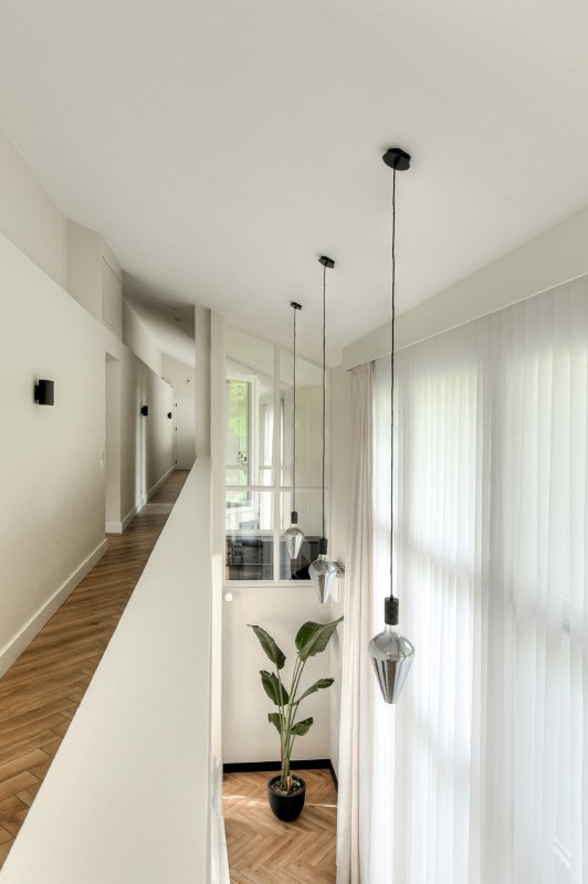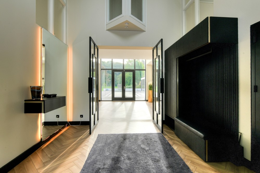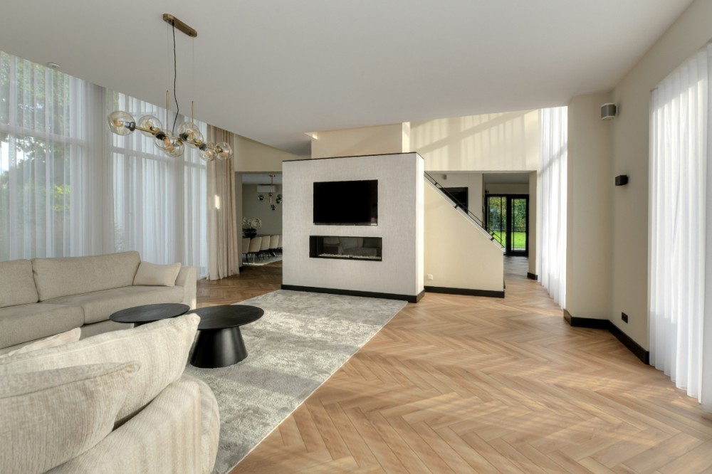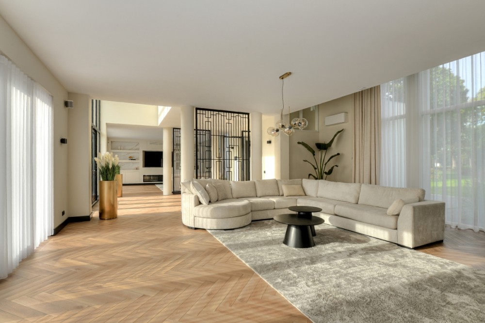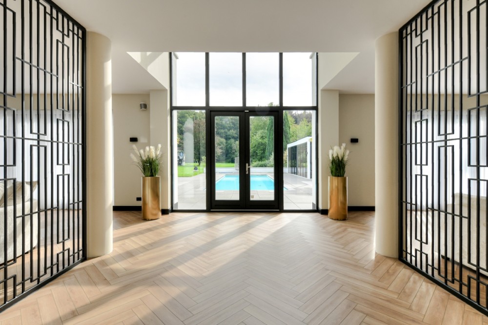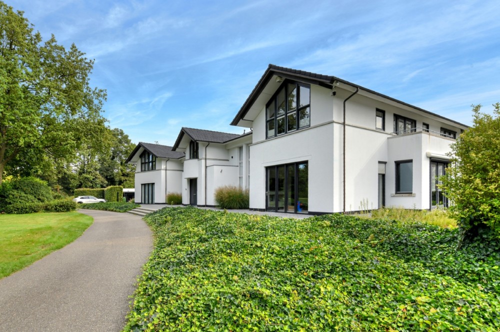 Je krijgt nooit een tweede kans voor een eerste indruk. Die begint zodra de elektrisch bedienbare poort aan de Hertenroep opent. Geflankeerd door strakke witte pilaren betreden we het terrein. Het uitgestrekte gazon met majestueuze bomen, statige hagen en de oprijlaan geven een gevoel van sereniteit. De villa is strategisch gepositioneerd op het perceel om de privacy van de bewoners maximaal te waarborgen. Wat direct opvalt, is de perfecte symmetrie van de imposante witte residentie. Een uniek exemplaar met uitgestrekte zichtlijnen en talloze raampartijen. Ramen die overigens geen directe inkijk bieden in de leefruimtes, zodat de privacy van de bewoners optimaal blijft. Hoewel de buitenkant van de villa heel statig oogt, straalt het interieur vooral warmte, sfeer, luxe en comfort uit. Onder andere vanwege het gebruik van hoogwaardige materialen, de aanwezigheid van een open haard, vloerkleden en vitrage. Stap binnen en ervaar de perfecte balans met de slimme, evenwichtige indeling.