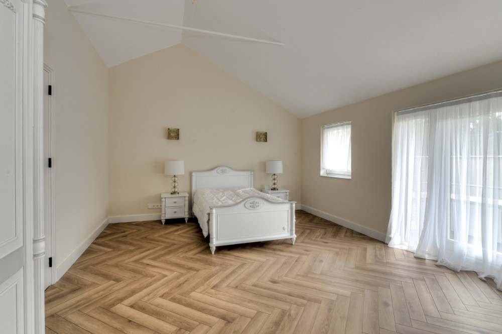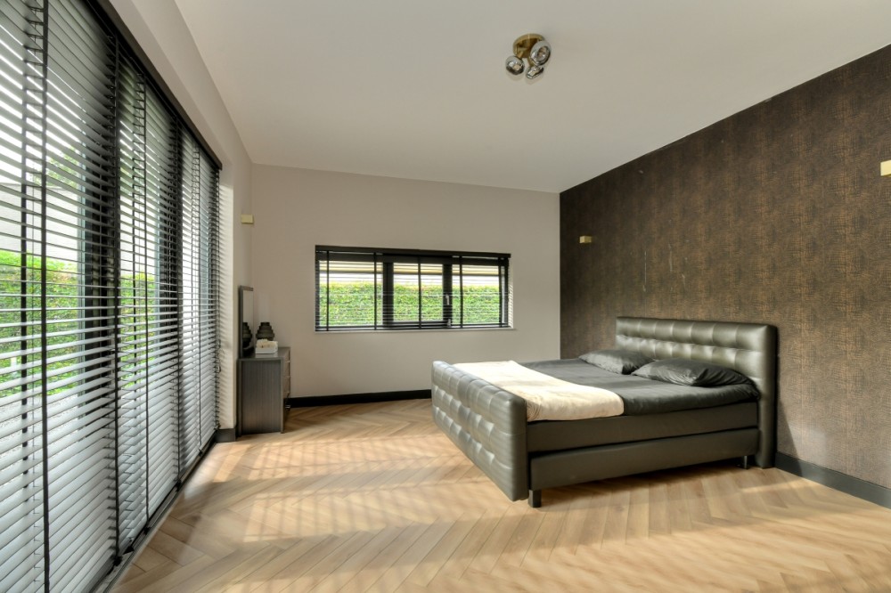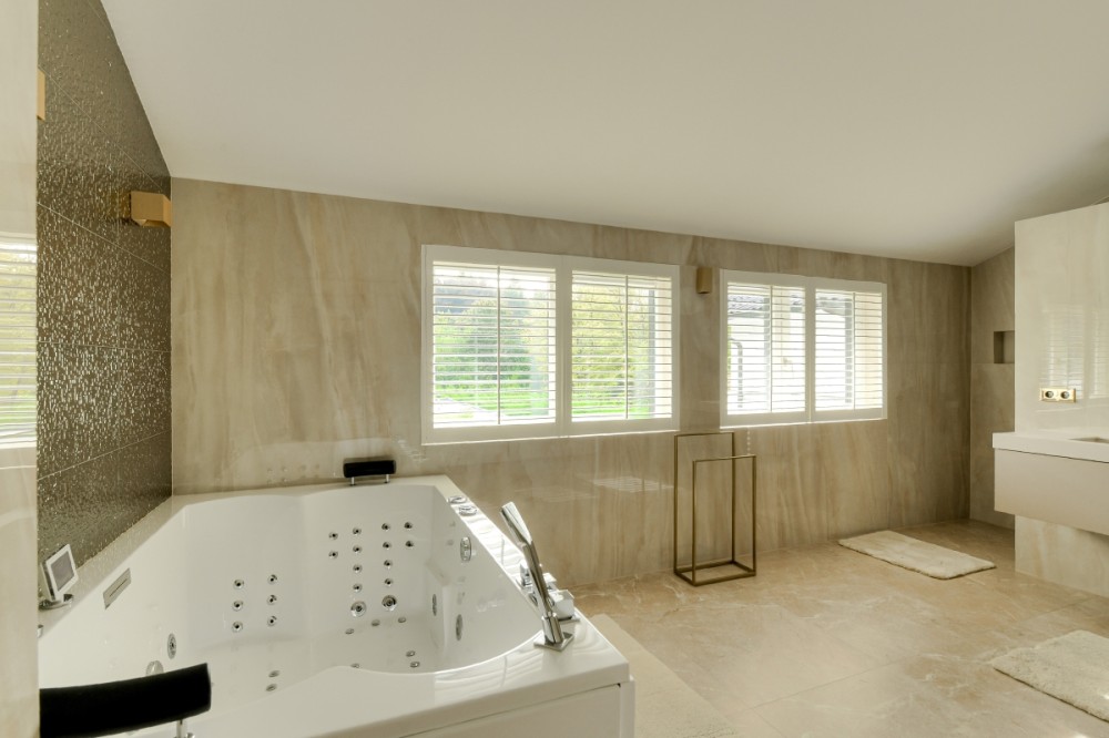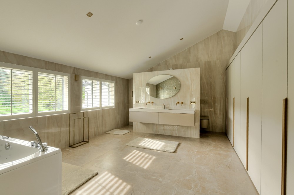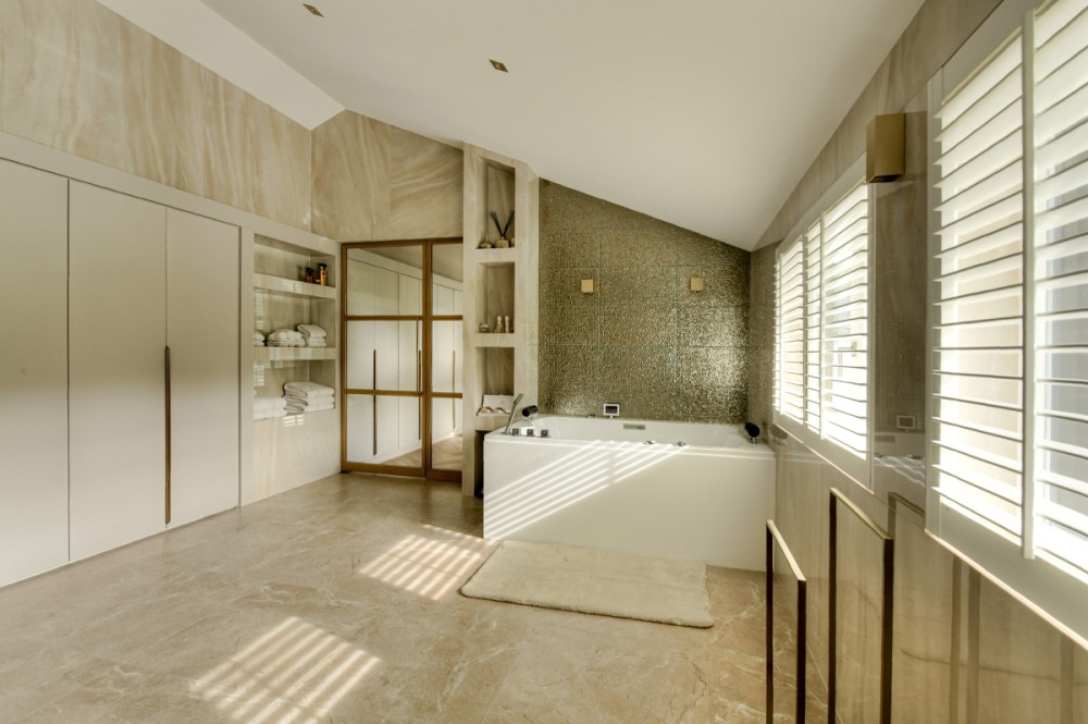 Niet alleen op de begane grond, maar ook op de bovenverdieping overheersen warmte, sfeer, luxe en comfort. De vide geeft deze de villa bovendien een ietwat speelse uitstraling. Boven zijn meerdere slaapkamers gerealiseerd. Zoveel dat de villa een heel fijn familiehuis zou zijn. Alle slaapkamers kloppen tot in detail, zijn prettig qua formaat en hebben veel lichtinval. Een pre is dat op de verdieping ook een fitnessruimte en twee extra badkamers aanwezig zijn. Daar komt de badkamer horend bij de masterbedroom nog bij. Hier slapen bewoners met het gevoel in een luxe hotelsuite met loft-achtige indeling te zijn neergestreken. Hoewel de slaap- en badkamer met elkaar in verbinding staan, zijn het duidelijk afzonderlijke ruimtes. De badkamer is voorzien van alles wat nodig is voor ultieme ontspanning aan het einde van de dag: marmeren wastafels om te verzorgen, een tweepersoons whirlpool bad om heerlijk te ontspannen, en een inloopdouche voor een verkwikkende opfrisbeurt. De zachte, natuurlijke kleuren en materialen stralen, net als in de masterbedroom, een gevoel van rust uit.