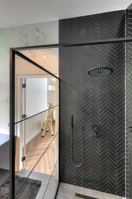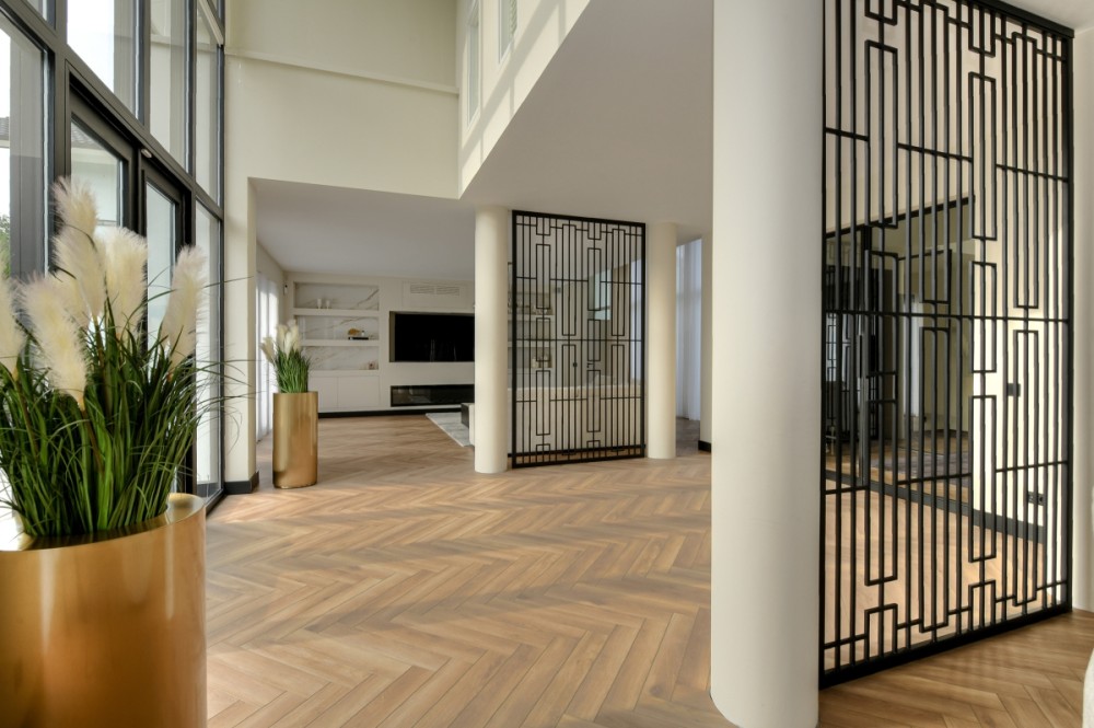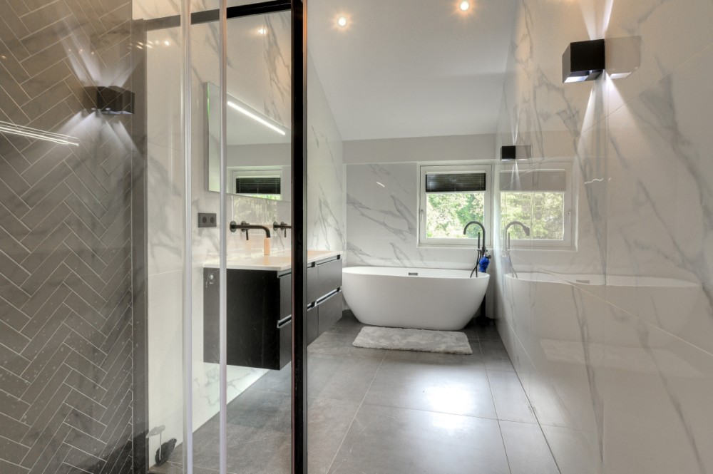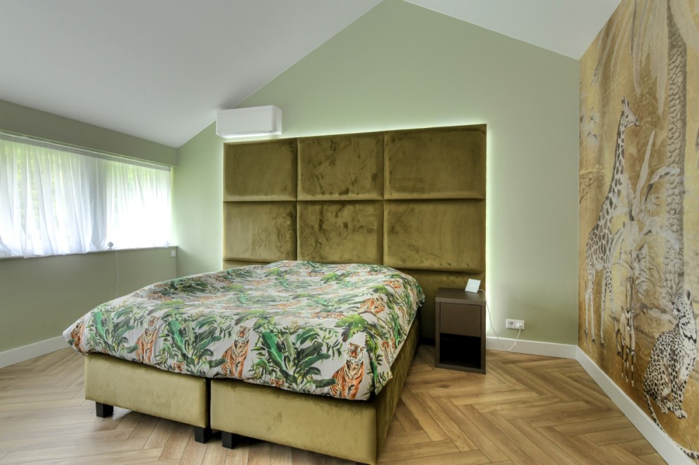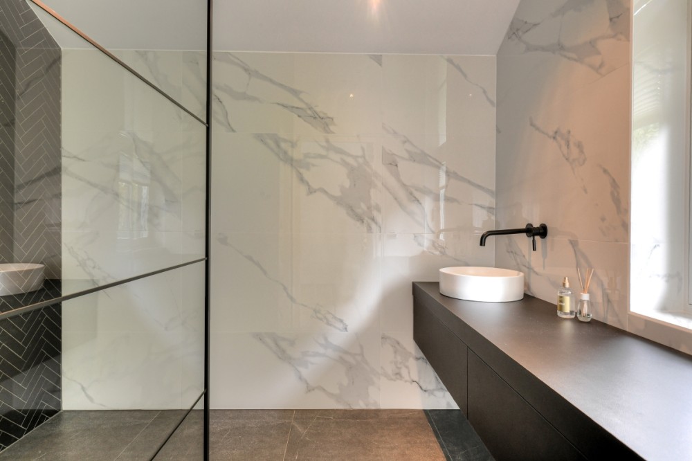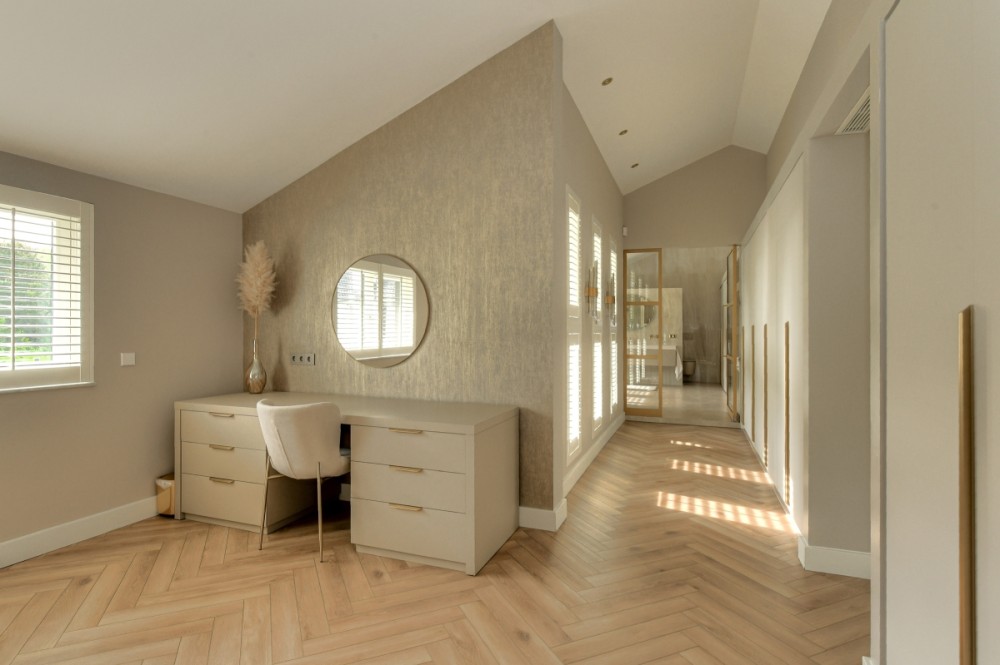 Niet alleen op de begane grond, maar ook op de bovenverdieping overheersen warmte, sfeer, luxe en comfort. De vide geeft deze de villa bovendien een ietwat speelse uitstraling. Boven zijn meerdere slaapkamers gerealiseerd. Zoveel dat de villa een heel fijn familiehuis zou zijn. Alle slaapkamers kloppen tot in detail, zijn prettig qua formaat en hebben veel lichtinval. Een pre is dat op de verdieping ook een fitnessruimte en twee extra badkamers aanwezig zijn. Daar komt de badkamer horend bij de masterbedroom nog bij. Hier slapen bewoners met het gevoel in een luxe hotelsuite met loft-achtige indeling te zijn neergestreken. Hoewel de slaap- en badkamer met elkaar in verbinding staan, zijn het duidelijk afzonderlijke ruimtes. De badkamer is voorzien van alles wat nodig is voor ultieme ontspanning aan het einde van de dag: marmeren wastafels om te verzorgen, een tweepersoons whirlpool bad om heerlijk te ontspannen, en een inloopdouche voor een verkwikkende opfrisbeurt. De zachte, natuurlijke kleuren en materialen stralen, net als in de masterbedroom, een gevoel van rust uit.