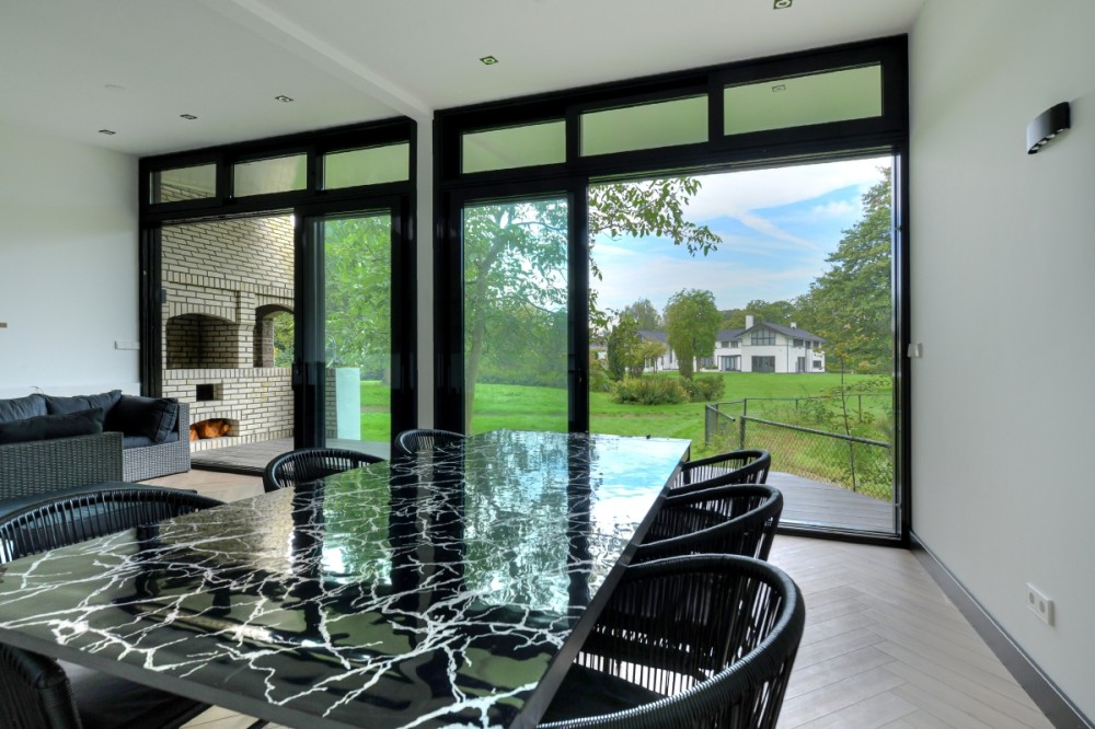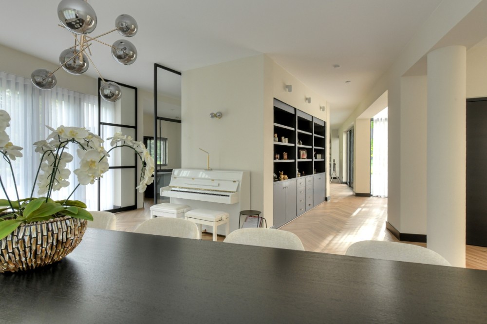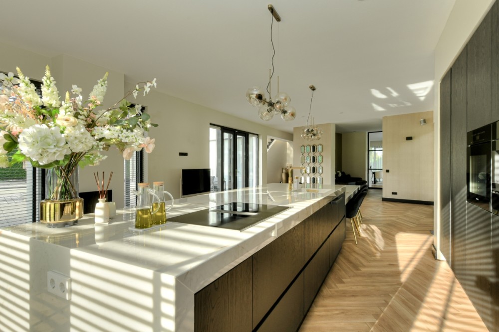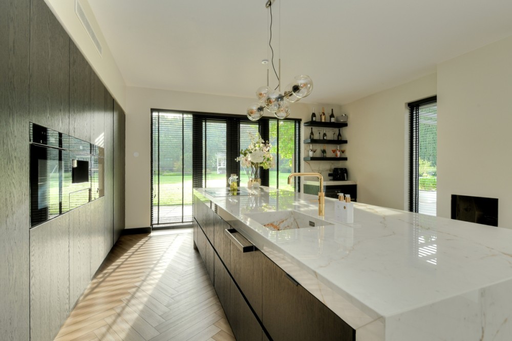 Dankzij de overvloed aan natuurlijk licht voelt binnenkomen in de hal erg prettig. Uitnodigend. De schitterende zichtlijn door de woonkamer naar het zwembad in de tuin is het eerste wat opvalt. Met aan zowel de linker- als de rechterzijde van deze lijn een woongedeelte. In de living in de linkervleugel van het huis vormt de open haard het middelpunt van het interieur. Neem hier rustig de tijd om de ruimte te ontdekken en ervaar de aantrekkelijke parkachtige tuin in verschillende facetten. De tuin voelt gewoon als een verlengstuk van de kamer. Achter de open haard betreden we, via een aparte eetkamer en een compacte werkruimte, de woonkeuken. Deze ruimte van ongeveer zestig vierkante meter is het warme, kloppende hart van het huis. Een plek waar familie en vrienden samenkomen rondom het kookeiland met de sfeervolle gashaard in hun kielzog. Voor uitgebreide lunches, brunches of diners. Uiteraard van alle moderne gemakken voorzien, met voldoende opbergruimte en door de vele ramen in directe verbinding met de rondom gelegen parkachtige tuin.