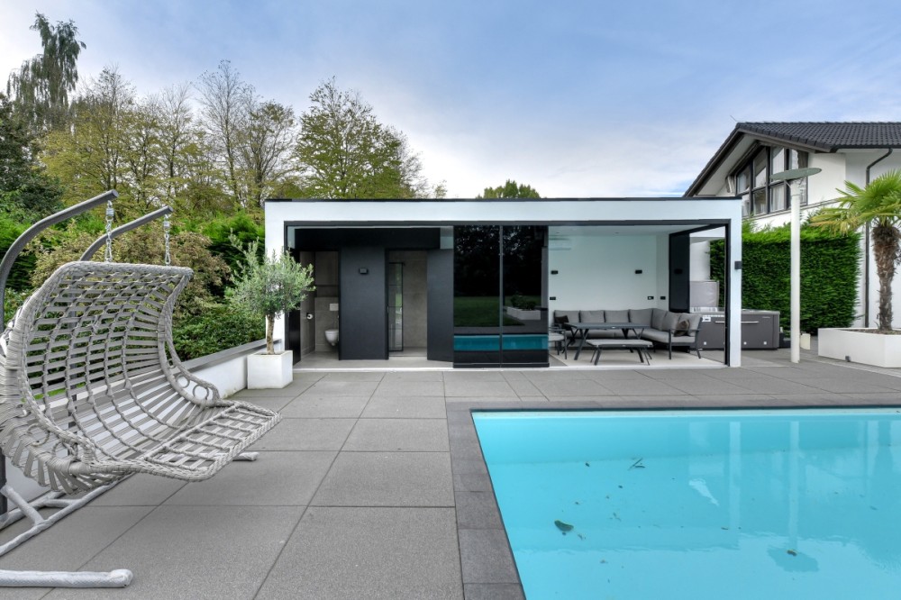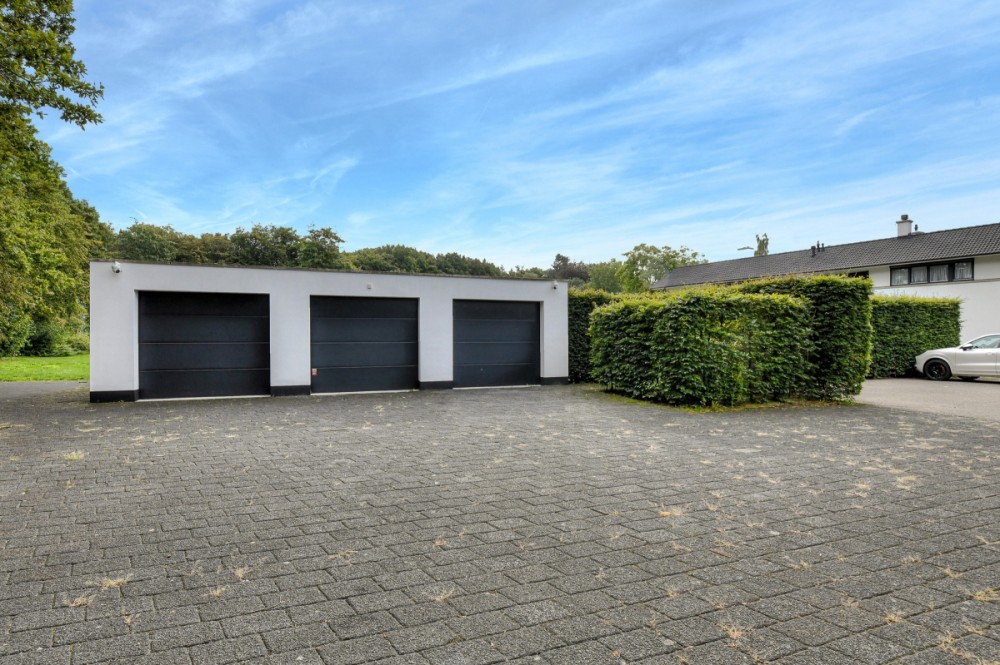 Wie een van de deuren opent en een voet zet in de tuin met parkachtige afmeting (13.000 m²) is waarschijnlijk betoverd. Dankzij de U-vorm van het huis genieten bewoners aan de achter kant van beschutting tegen de wind. Deze tuin heeft daarnaast alles wat verwacht mag worden van zo’n exemplaar van formaat. Het is een harmonieuze mix van bomen, struiken en gazon. Inclusief diverse zithoeken, terrassen, een gashaard, een verwarmd zwembad met luxe buitenverblijf (inclusief keuken, douche en toilet). Kers op de taart voor de jongste bewoners is het speelhuisje, dat haast een mini-replica is van de villa. Links achterin de tuin bevindt zich een grote vijver met een verscholen buitenverblijf. Dit is uitgerust met een woonkamer, keuken en badkamer. Ideaal wanneer gasten in alle rust willen blijven logeren. Of voor opgroeiende pubers, die gesteld zijn op hun privacy. Nog iets verderop is een hek met een poort. Wie met een golfset door dat hek wandelt en honderd meter loopt, staat bij de eerste hole van de 18-holes Golfpark De Haenen.