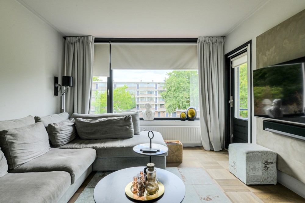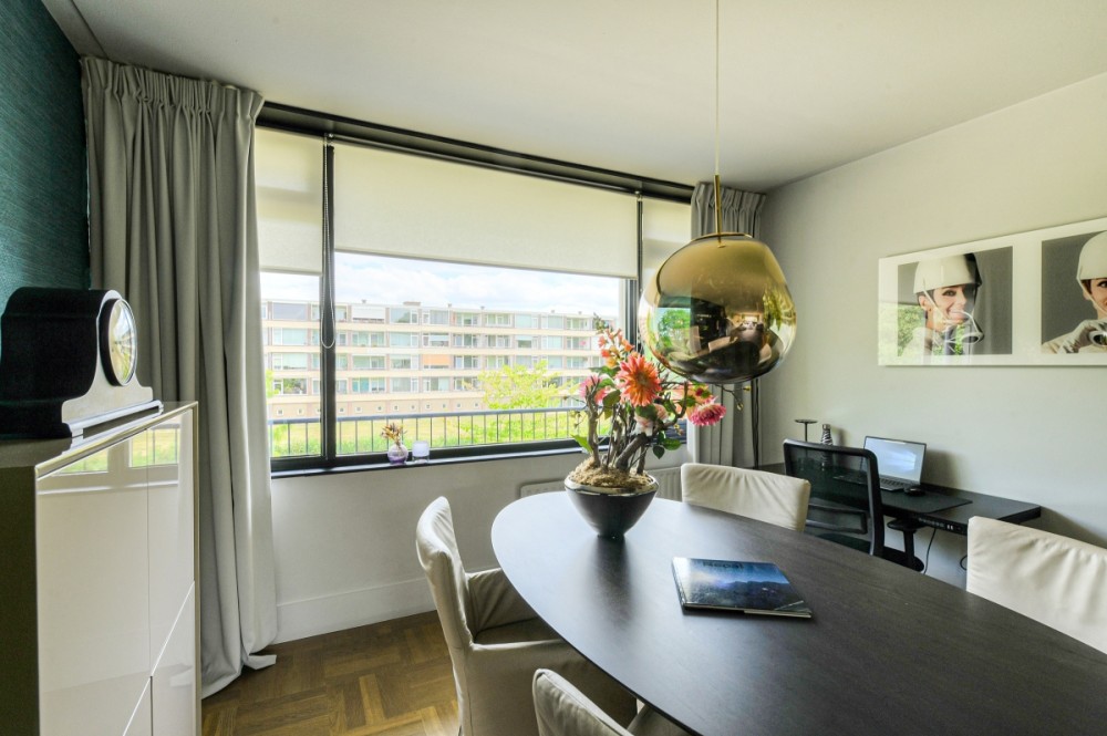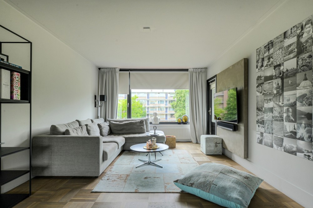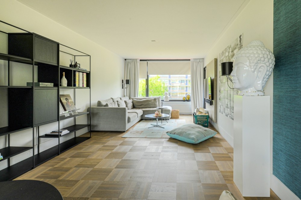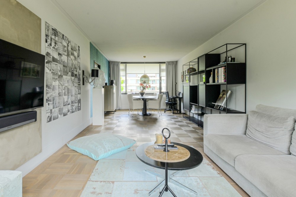 Riante woon/eetkamer van circa 36 m2 met parketvloer, strakke wandafwerking en toegang tot het balkon op het westen. De woonkamer is vergroot door het samenvoegen van een slaapkamer bij de woonkamer. Op eenvoudige wijze zou hier ook weer een slaapkamer te realiseren zijn.