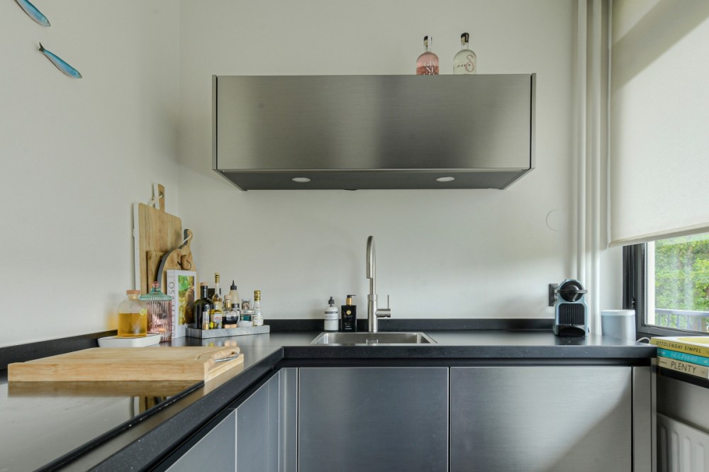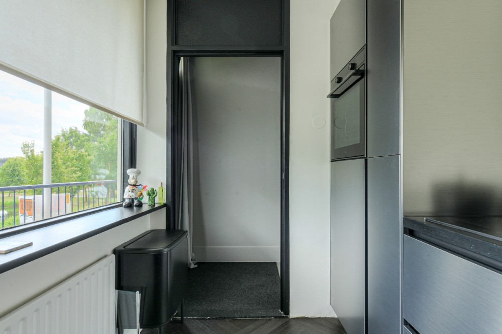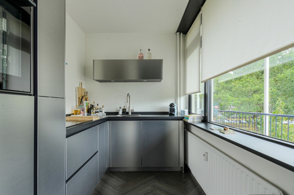 De keuken is aan de galerij zijde gelegen en is voorzien van een pvc vloer in visgraat patroon gelegd. De hoekkeuken is onlangs geplaatst en modern van opzet met een luxe uitstraling en hoogwaardig afgewerkt. De keuken is uitgerust met diverse inbouwapparatuur, te weten; inductie kookplaat, vaatwasser, combi(stoom)oven en koelkast met vriesvak bovenin.