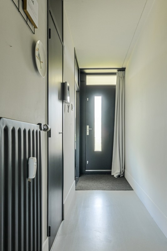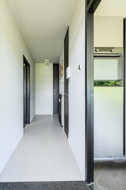 Hal/entree met strakke gietvloer en meterkast. Vanuit de hal zijn de diverse vertrekken te bereiken.