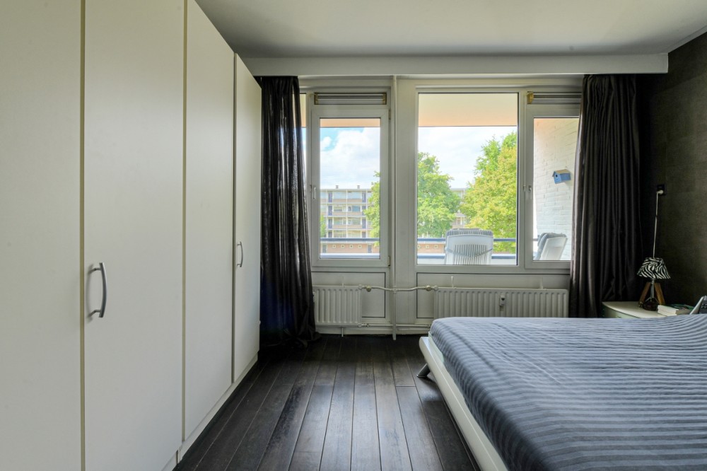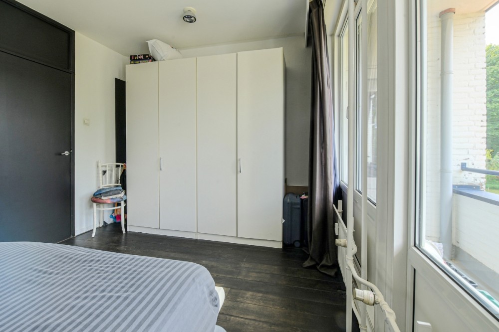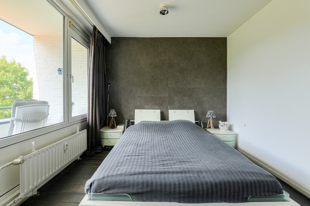 De slaapkamer is aan de balkonzijde gelegen en heeft een afmeting van circa 12 m2 met een eiken houten vloer.