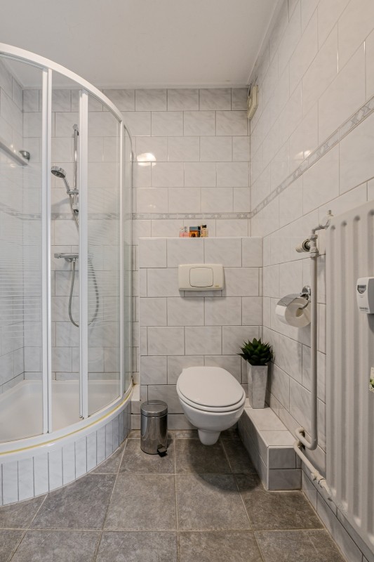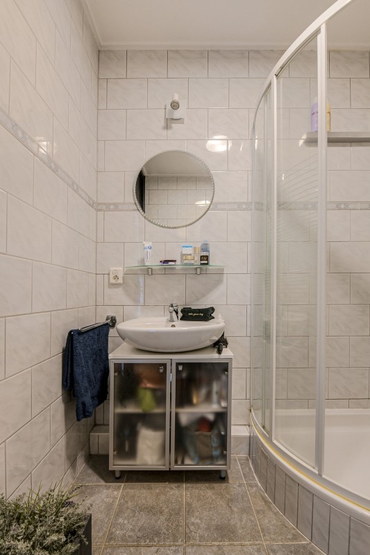 De betegelde badkamer is voorzien van douche, vaste wastafel en het toilet.