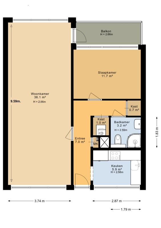-Huidige 2-kamer appartement is eenvoudig terug te brengen in een 3-kamer appartement;