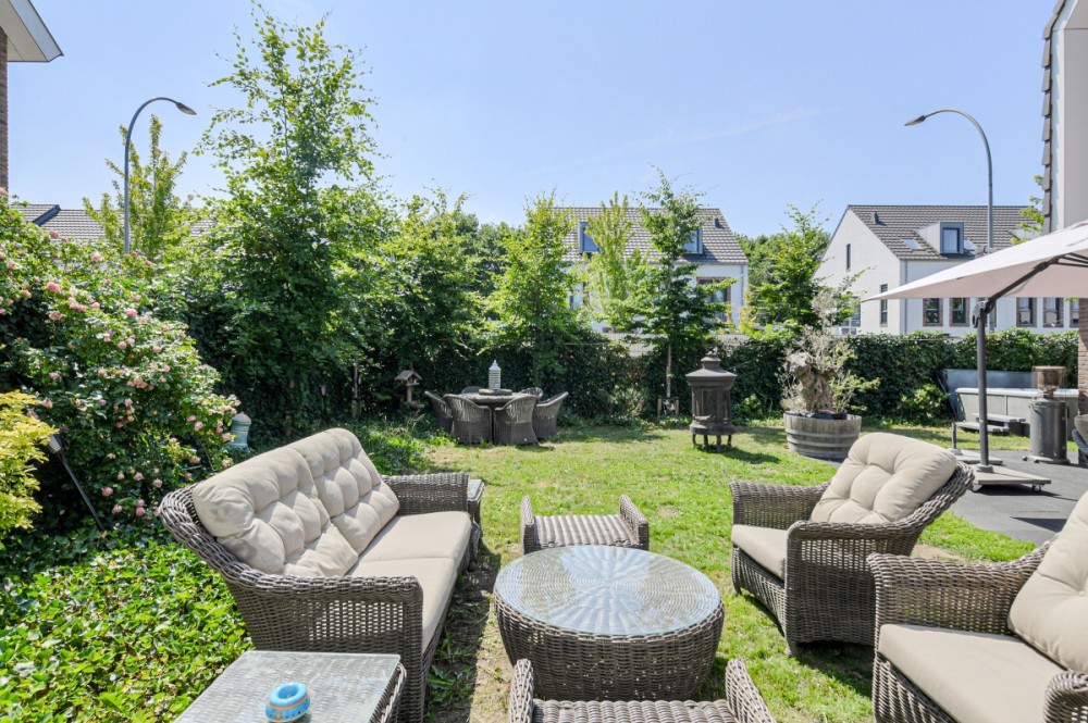 De tuin is rondom de woning gelegen, geheel omsloten en uitgerust met een zonneterras, grasveld, en achterom. Door de ligging rondom de woning geniet men vrijwel de gehele dag van de zon.