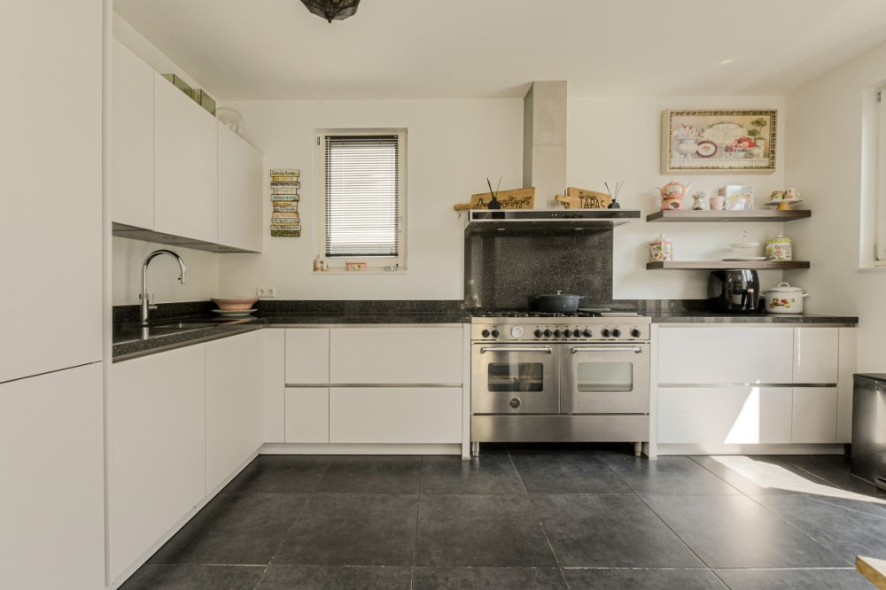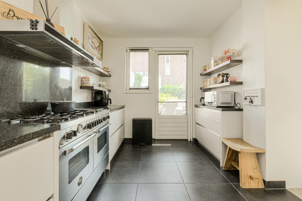 De woon/eetkeuken, afm. ca.4.93 x 2.58m., is aan de achterzijde van het pand gesitueerd en uitgerust met een nette keukeninrichting in L opstelling met composieten werkblad en diverse inbouwapparatuur, te weten; koelkast, vriezer, vrijstaand fornuis met oven, afzuigkap en zijraam met zicht op de tuin. De keuken is voorzien van diverse grote lades en boven/ onderkastjes. Middels de loopdeur is de achtertuin te bereiken.