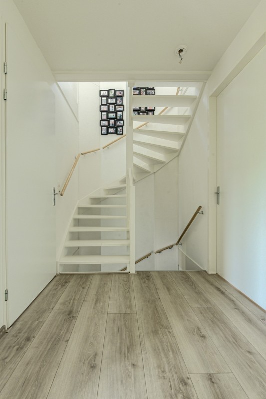 Overloop welke toegang geeft tot de 3 slaapkamers, 1 kastenkamer, de badkamer en de trapopgang naar de tweede verdieping. De gehele eerste verdiepingsvloer, m.u.v. de badkamer, is voorzien van een laminaatvloer.