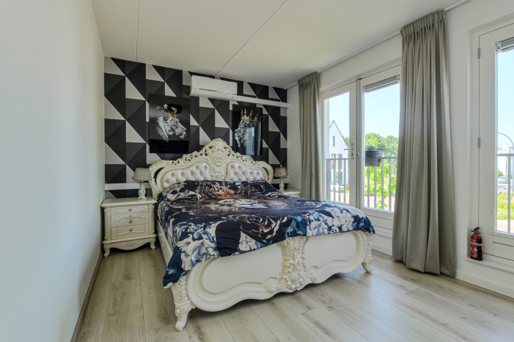 Slaapkamer 1. voorzijde, afm. ca. 16,4m², met dubbele openslaande deuren, laminaatvloer en airconditioning.