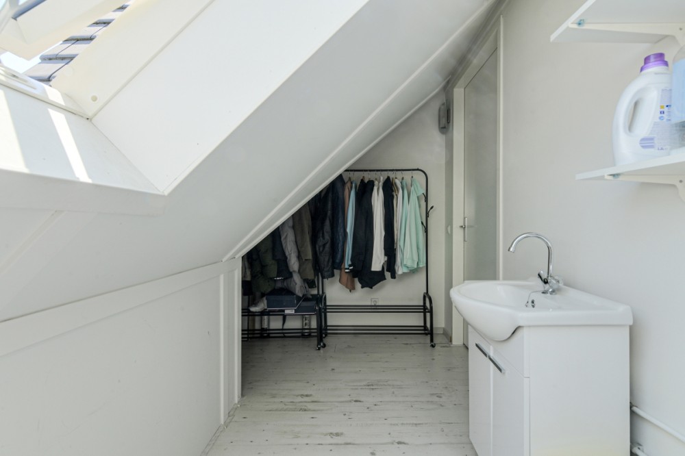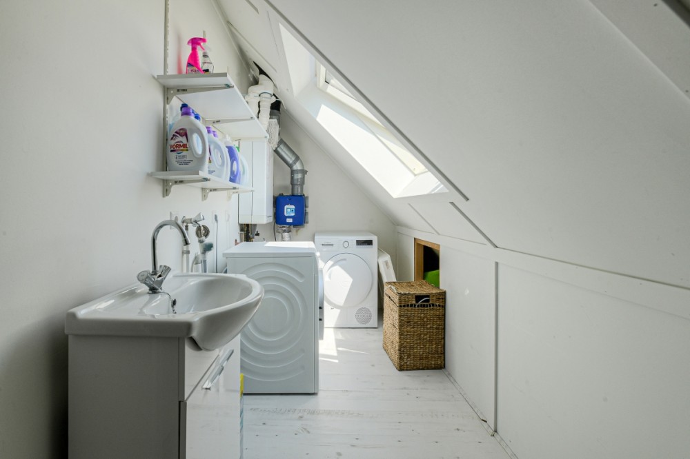 Middels vaste trap toegang tot de overloop met aansluitingen voor de was apparatuur en opstelplaats CV- combiketel, ventilatie-unit en bergruimte. Voorts toegang tot de 4e riante slaapkamer en tot de tweede badkamer. De tweede verdieping is voorzien van een laminaatvloer.