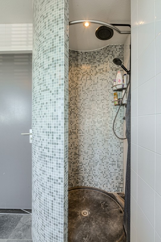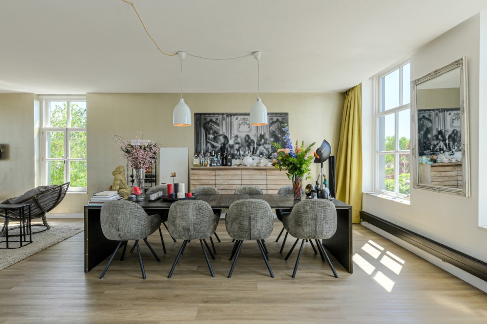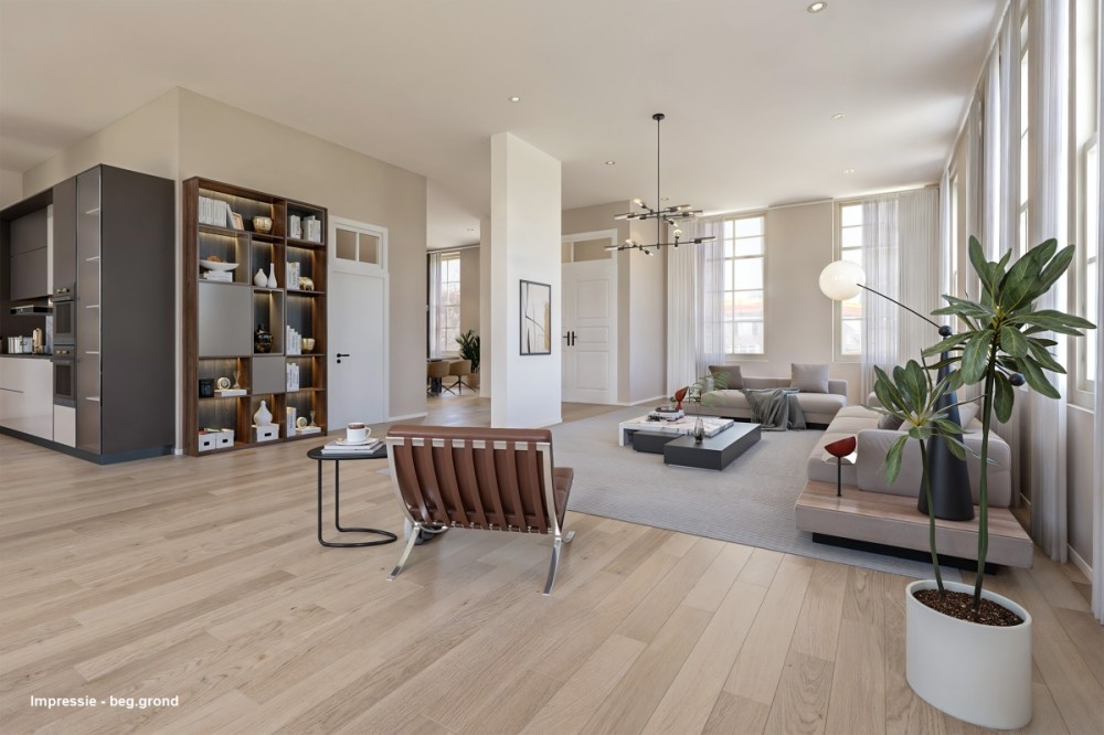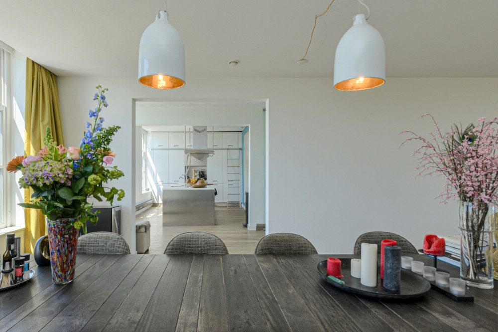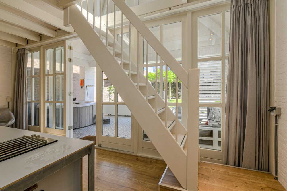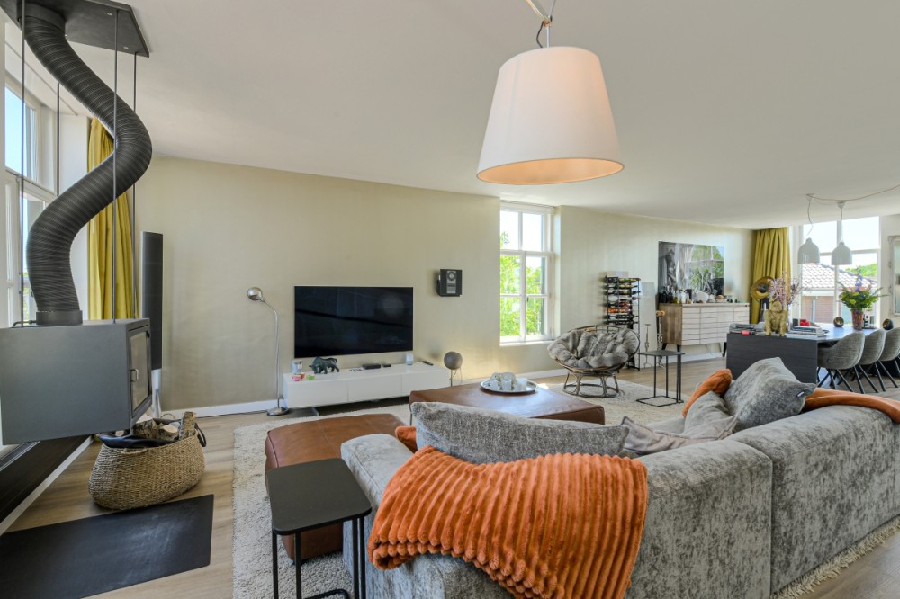 Via een tussenhal komt u in de woonvertrekken. De muren van de voormalige centrale gang zijn grotendeels komen te vervallen waardoor de diverse vertrekken geweldig in elkaar overlopen. Hierdoor krijgt u naast de grote raampartijen een bijzonder ruimtelijk gevoel en veel lichtinval.