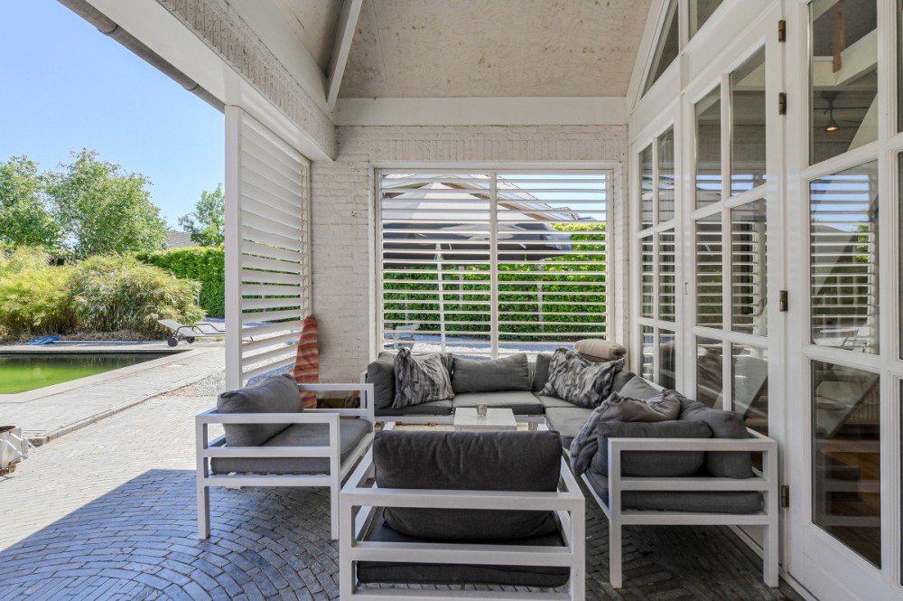 -Onder architectuur aangelegde tuin met prachtig buitenverblijf, sauna en zwemvijver.