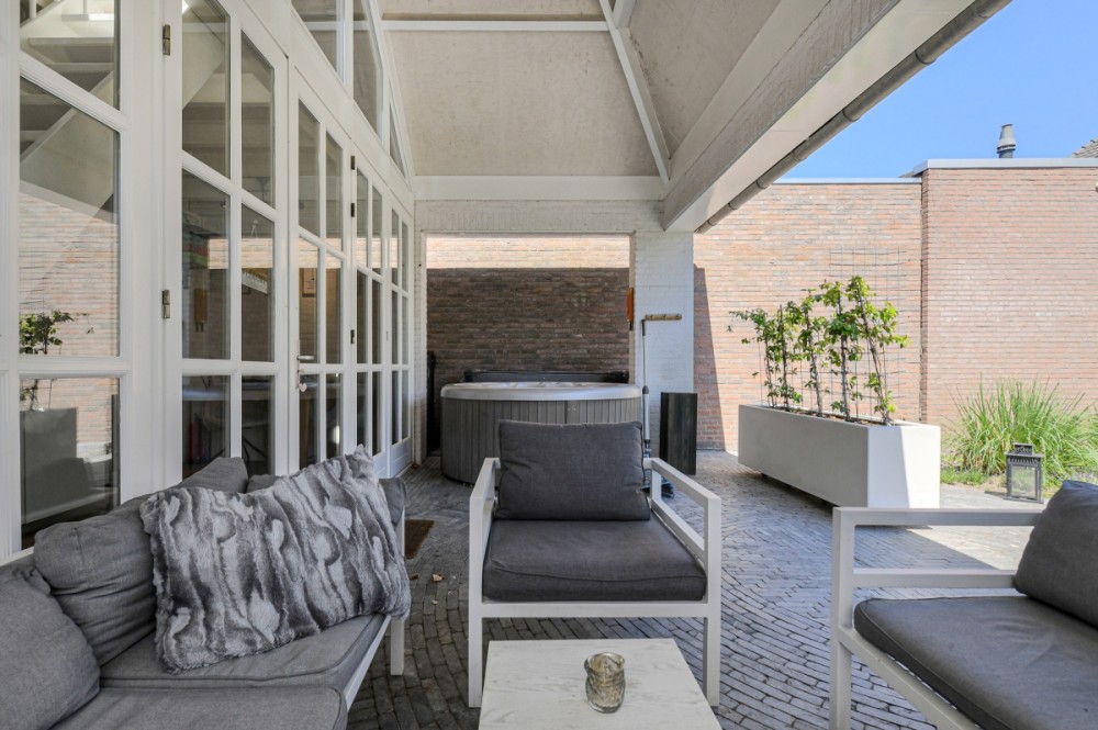 De bijzonder sfeervolle tuin, gelegen op het zuid/westen is geheel onder architectuur aangelegd en biedt veel privacy. De mooie strakke belijning is doorgetrokken in de gehele tuin.