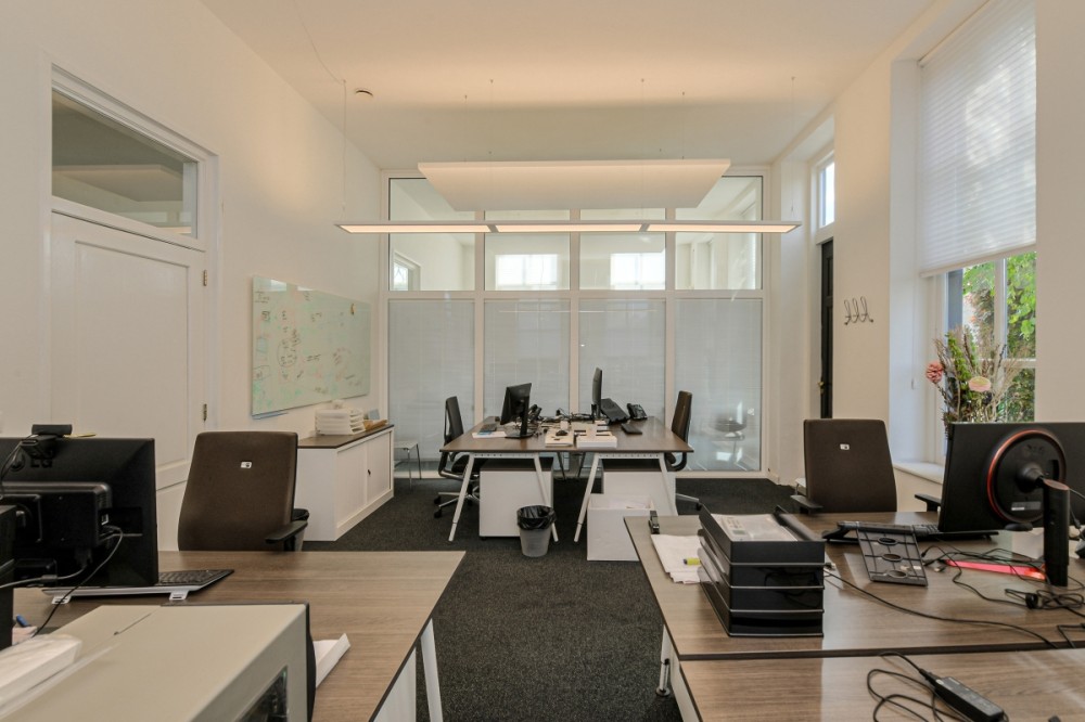 Kantoorruimte afm. 10.50 x 4.73 m. met toegang tot de zijtuin. Deze kantoorruimte is qua grootte op te splitsen in 2 afzonderlijke kantoren middels een vast kozijn van aluminium met glas en in de spouw van het glas plissé gordijn.