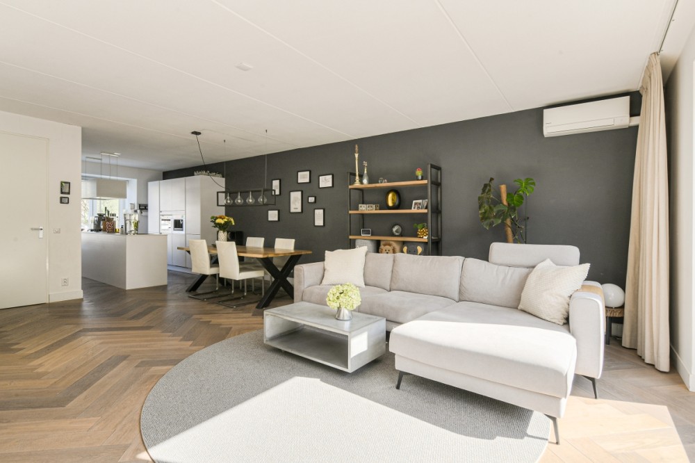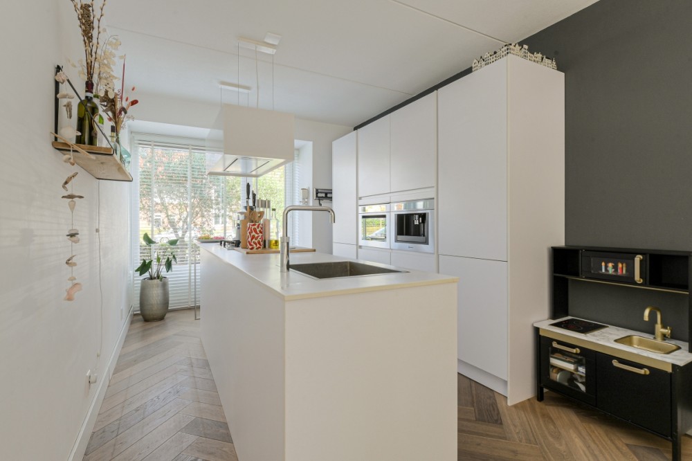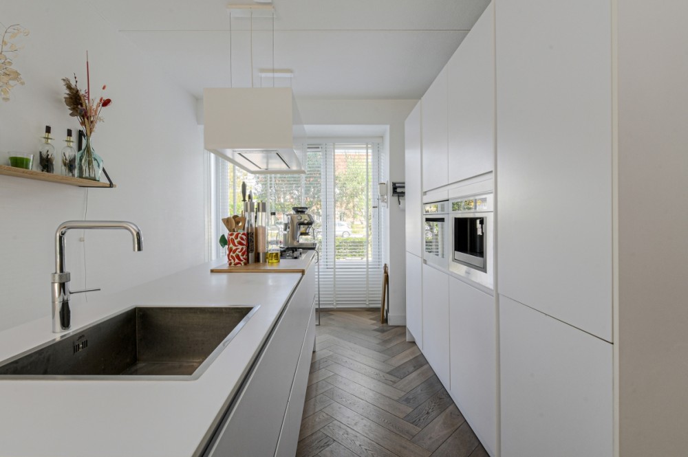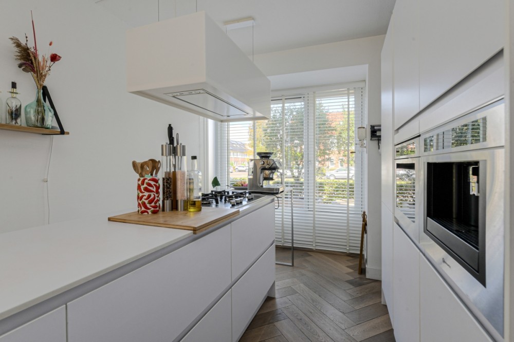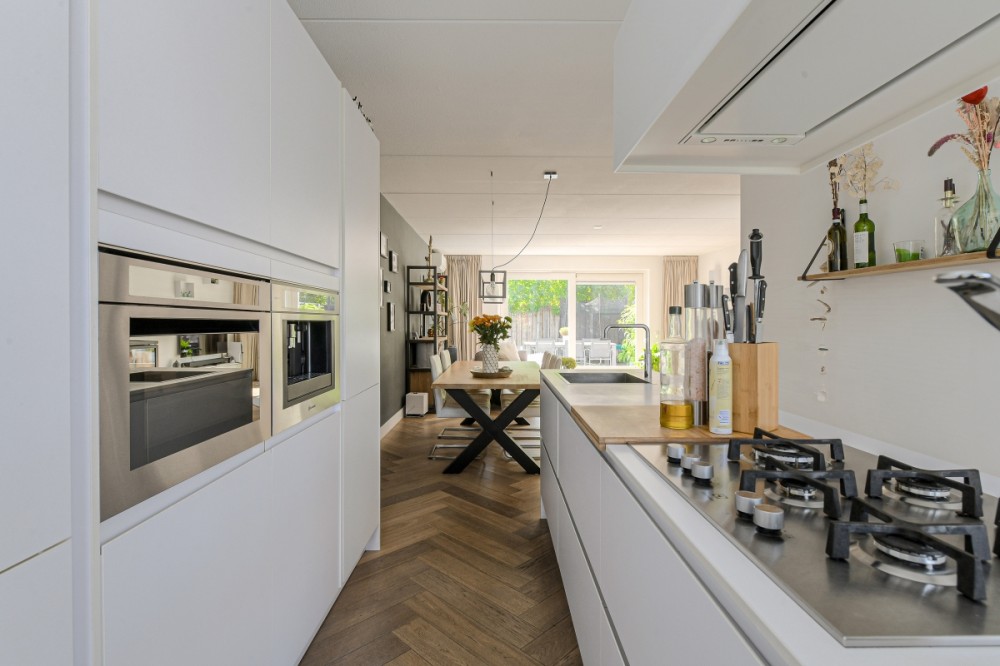 De aan de achterzijde uitgebouwde woonkamer is voorzien van een houten visgraatvloer, vaste kast en schuifpui naar de achtertuin. Aan de voorzijde gelegen open keuken afm. ca. 10m². is uitgerust met een luxe keukenblok met composiet werkblad en diverse Bauknecht inbouwapparatuur te weten; 5 pits gaskookplaat (Elektrolux), RVS-afzuigschouw met ingebouwde verlichting (Novy), combimagnetron, oven, quooker, vaatwasser, koelkast en voldoende kastruimte.
