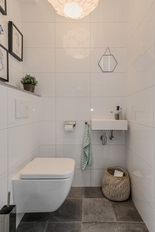 Entree/lichte hal met meterkast, toiletruimte met hangcloset en fonteintje, en trapopgang naar de eerste verdieping.