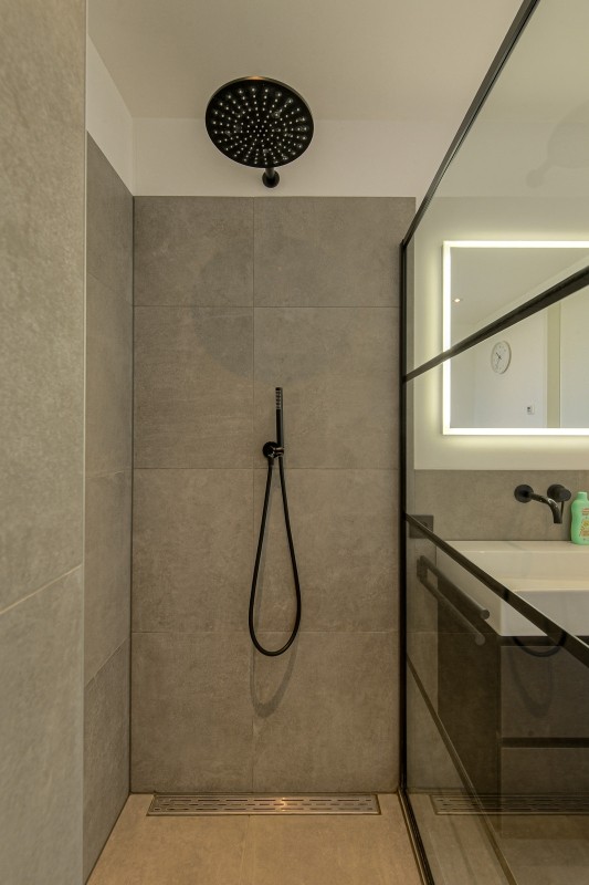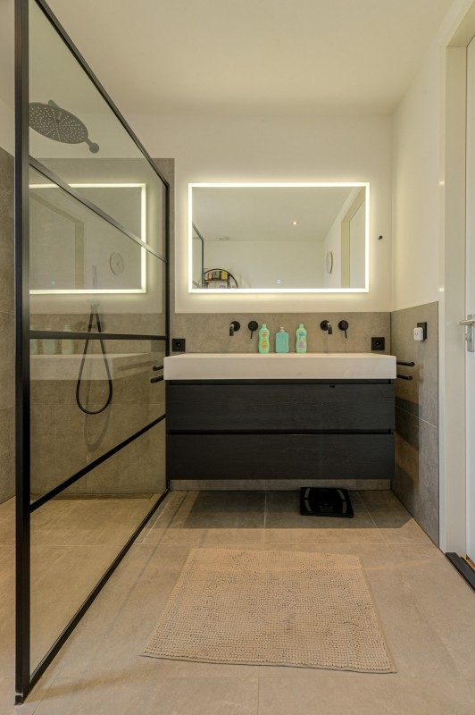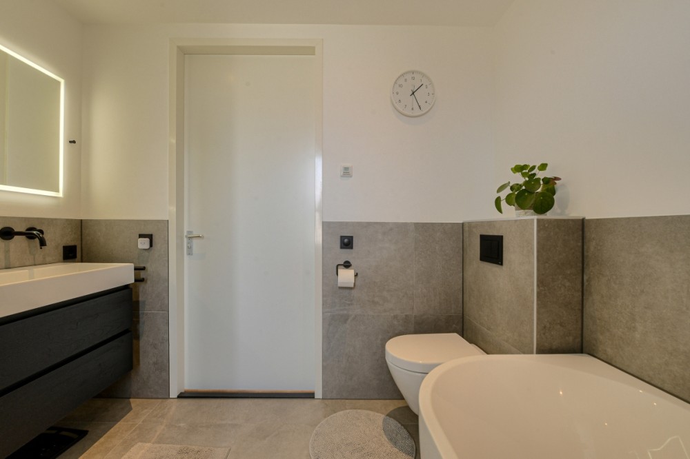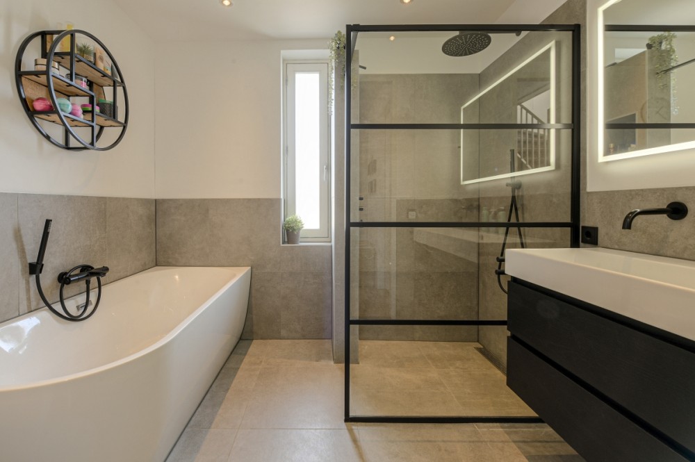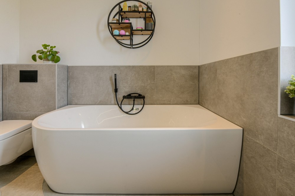 Luxe badkamer met ligbad, inloop (stort)douche, wastafelmeubel met twee kranen en tweede hangcloset.