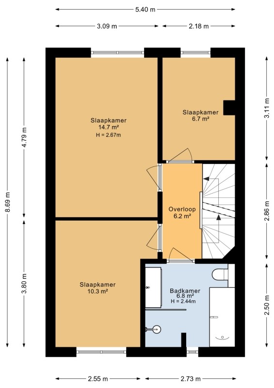 Overloop met toegang tot 3 slaapkamers alsmede tot de badkamer. Overloop en slaapkamers voorzien van een hoogwaardige PVC vloer. Slaapkamer achterzijde afmeting circa 14,7 m² met airconditioning en draai/kiepramen.. Slaapkamer voorzijde afmeting circa 6,7 m² met draai/kiepramen. Slaapkamer achterzijde afmeting circa 10,3 m² met draai/kiepramen.